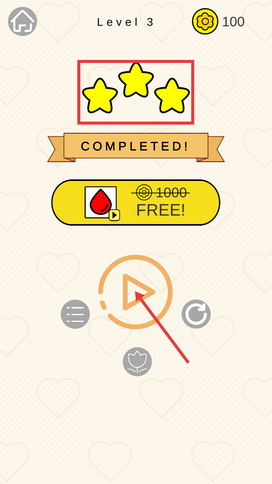 4、成功让杯子接满水后,关卡达成【三星】评价,点击中间的【播放】按钮,可继续挑战下一关并获取奖励。