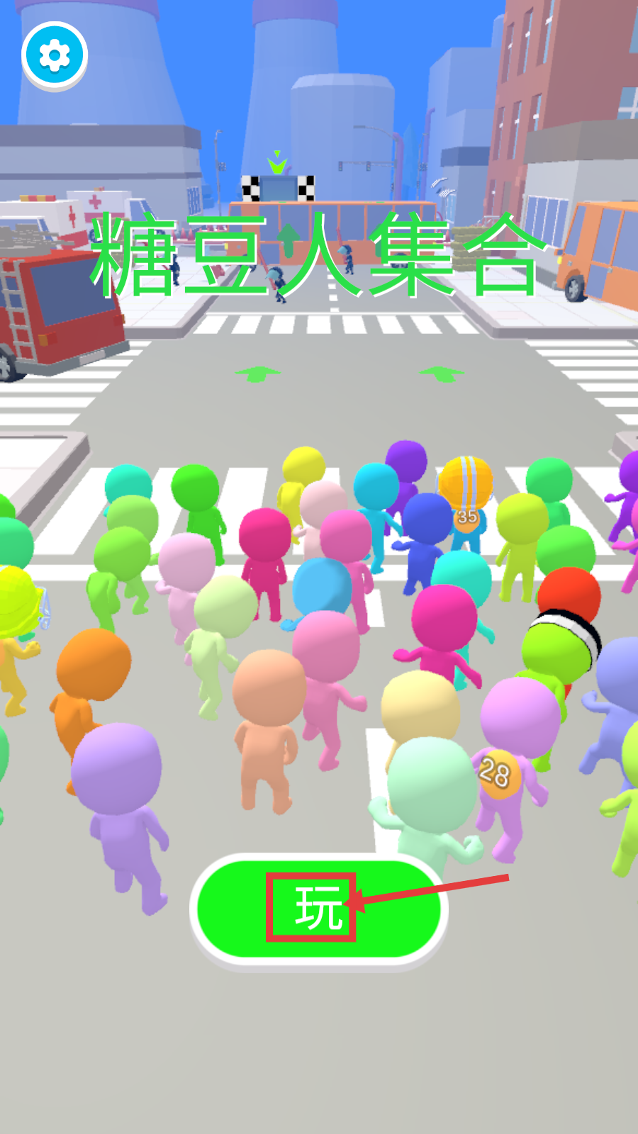 1、进入游戏界面,看到“糖豆人集合”提示后,点击下方绿色【玩】按钮,开启关卡挑战。