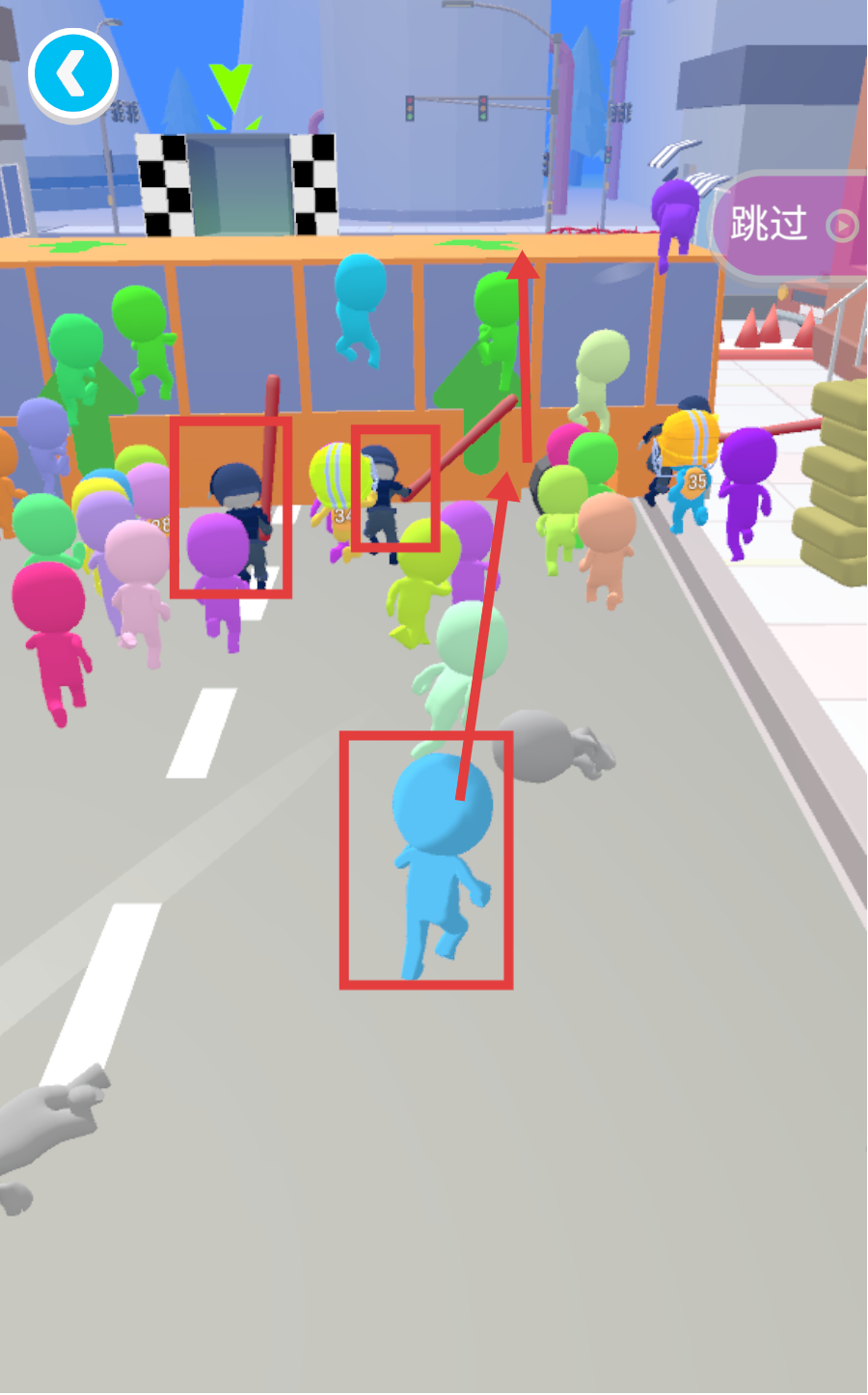 2、关卡中操控角色前进时,注意躲避拿棍子的阻拦角色,沿着箭头指引方向,往目标区域移动。