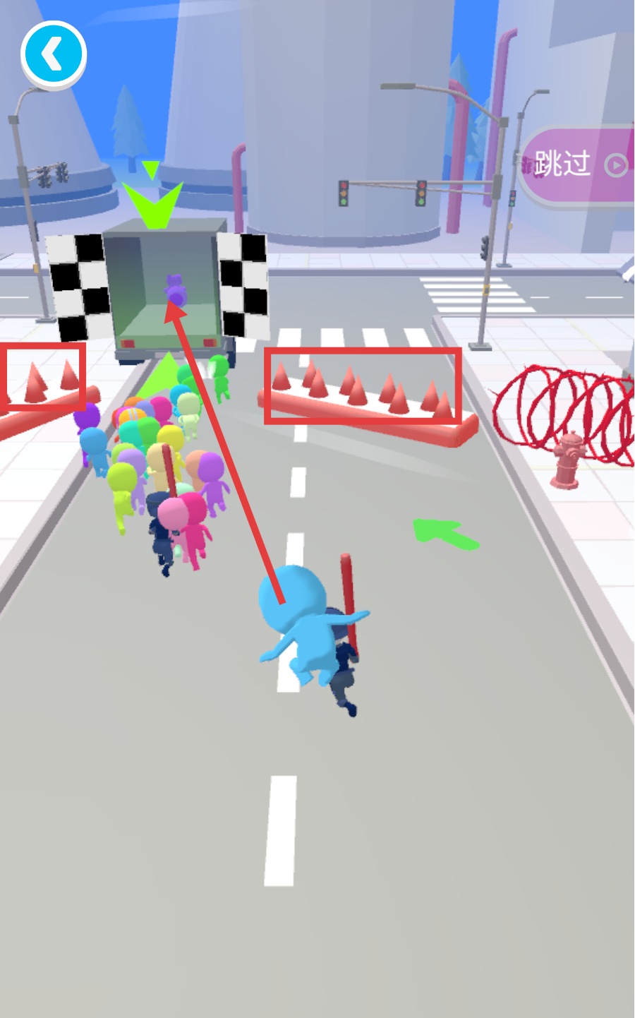 3、接近终点时,避开道路两侧带尖刺的障碍物,专注冲向带有黑白格标志的车辆,争取进入其中。