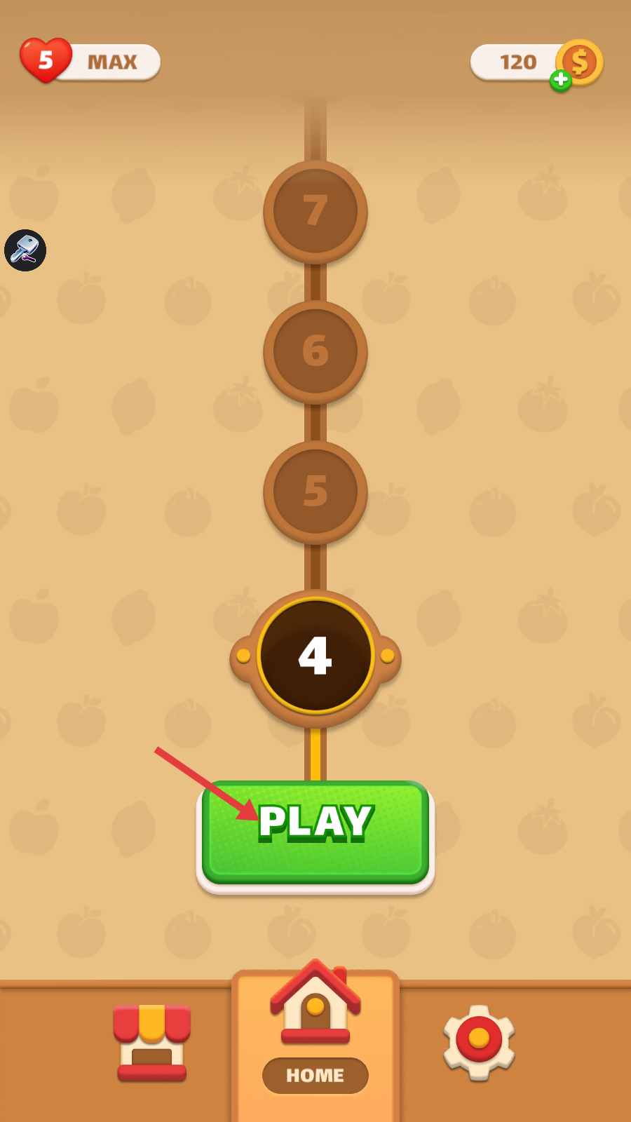 1、进入游戏后,点击绿色【PLAY】按钮,选择第4关开始挑战,准备进行水果匹配任务。