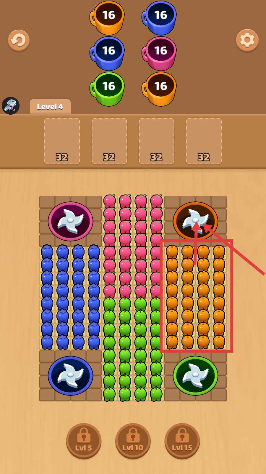 2、在Level4关卡中,观察橙色水果区域,利用右侧橙色旋转道具,规划水果的匹配路径,为后续填充杯子做准备。