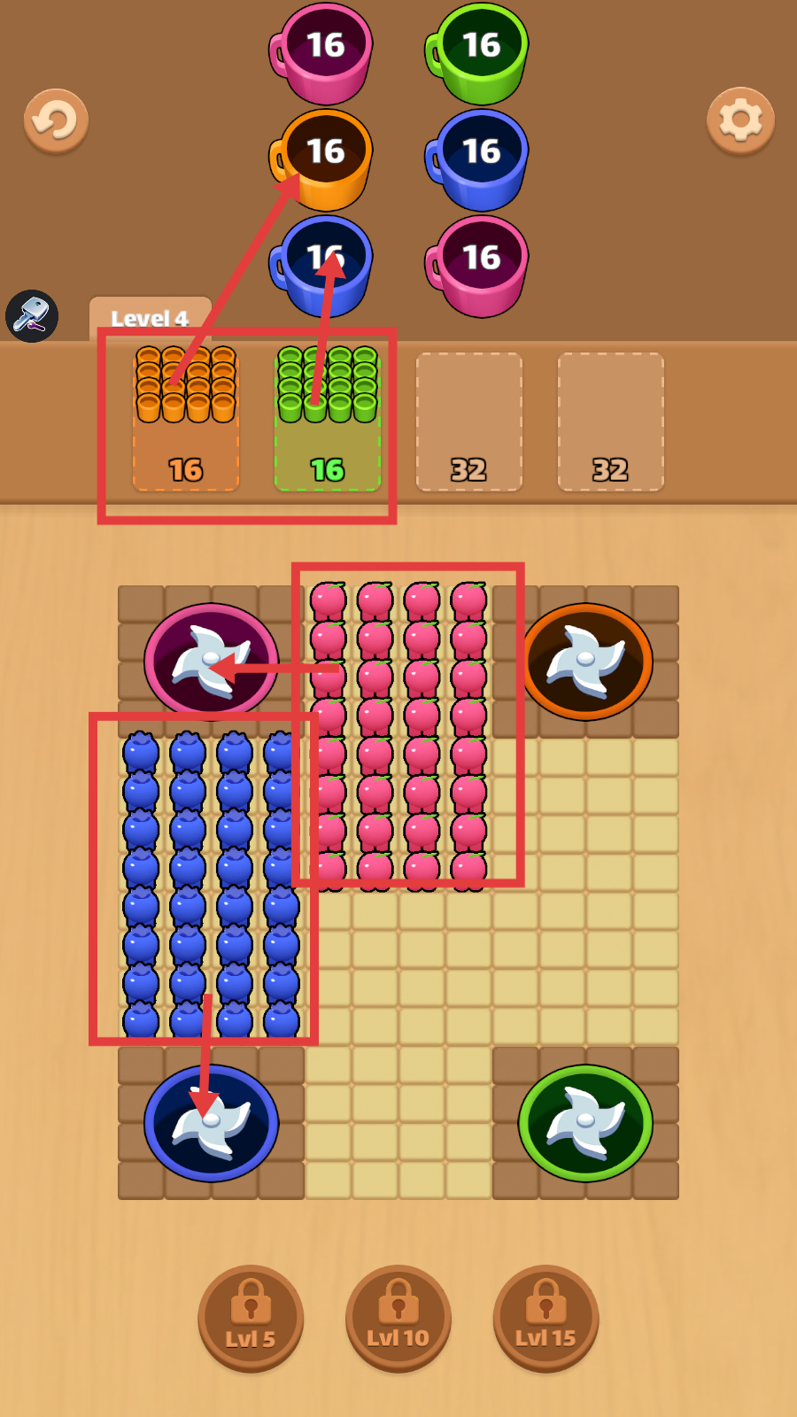 3、根据上方杯子的颜色与数字(如橙色16、绿色16等),将对应颜色的水果匹配到指定区域,借助旋转道具高效完成匹配。
