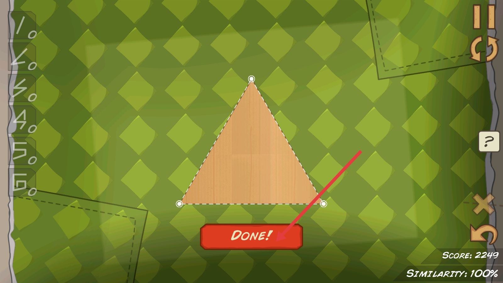 4、当木板成功切割为目标形状且【Similarity】达100%时,点击红色【DONE!】按钮,完成关卡挑战,获取高分奖励。