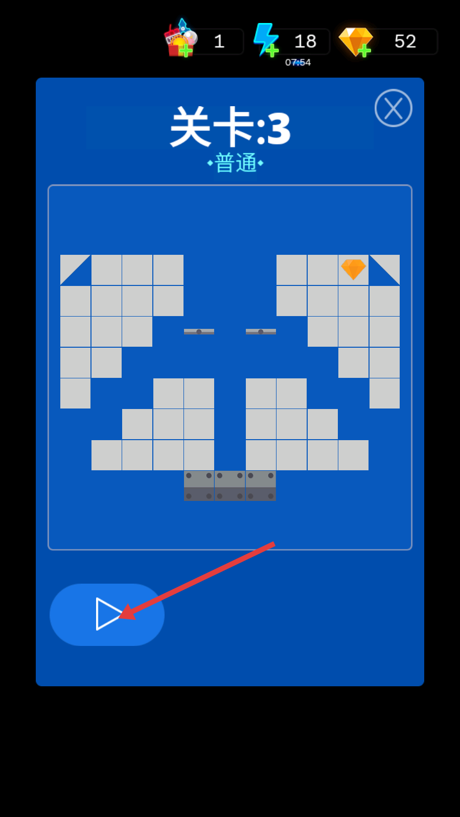 1、进入【关卡-3】普通难度,点击下方播放按钮,开启弹球消除方块的挑战,准备规划弹球路径。