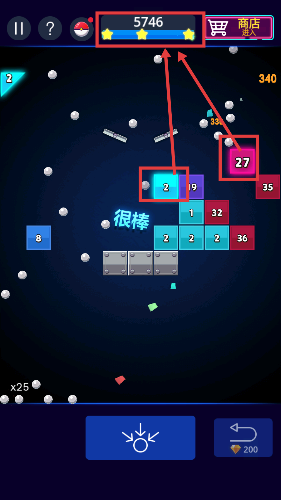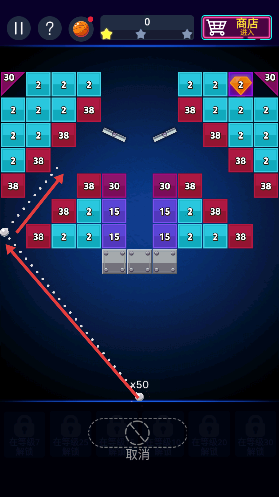 2、操控弹球,瞄准带有数值的方块,利用弹球弹射机制,击打【38】【30】等方块,逐步消除目标。