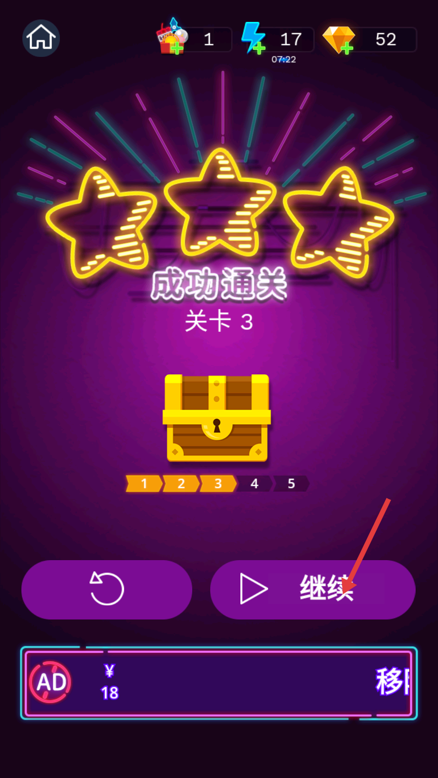 4、成功通关【关卡-3】,获得三星评价,点击【继续】按钮,可开启下一关挑战,领取通关奖励。