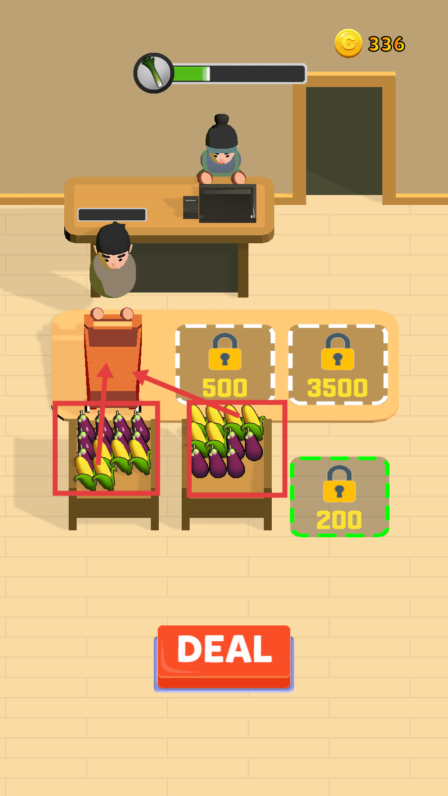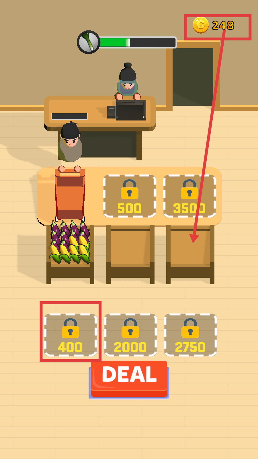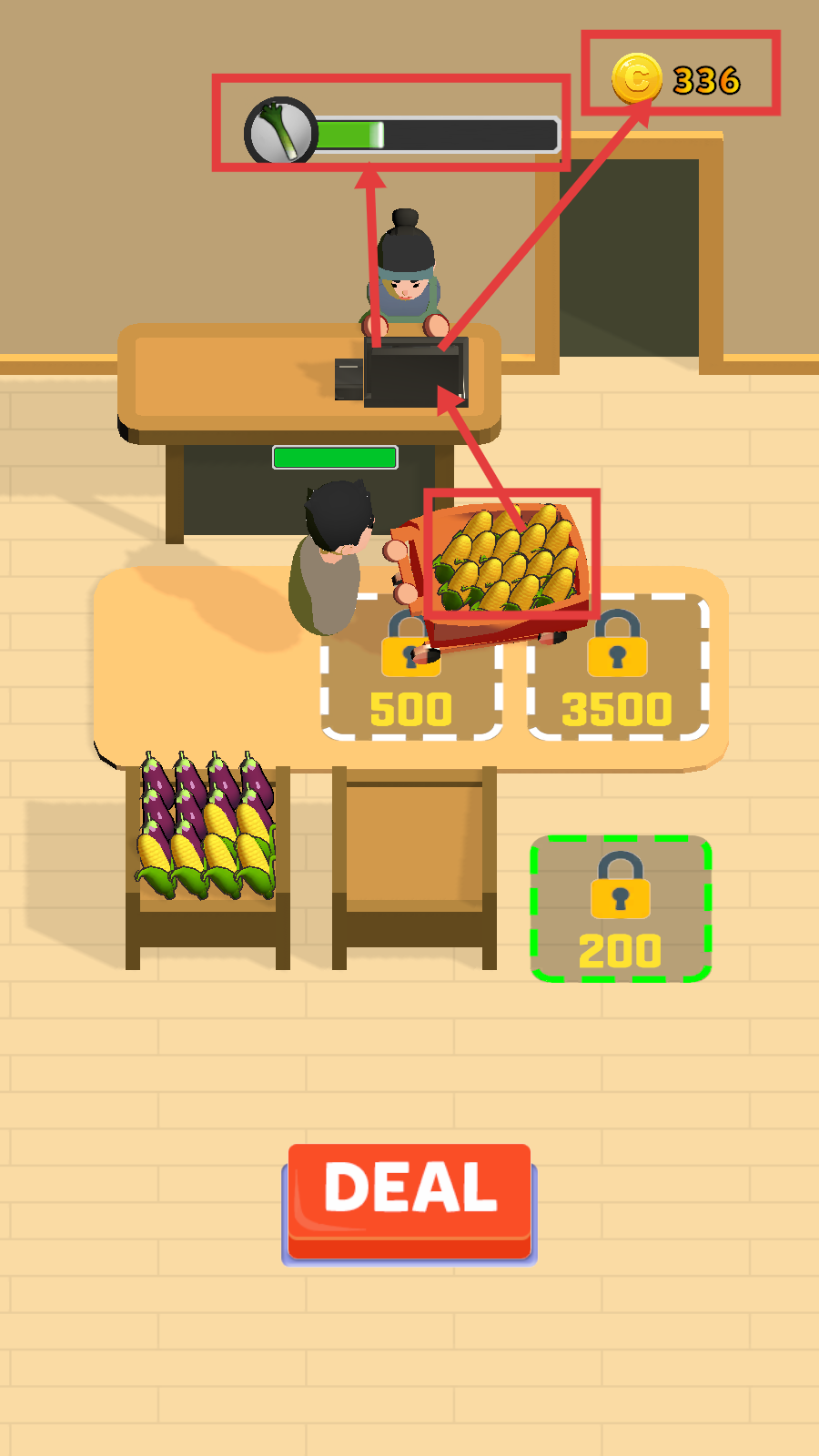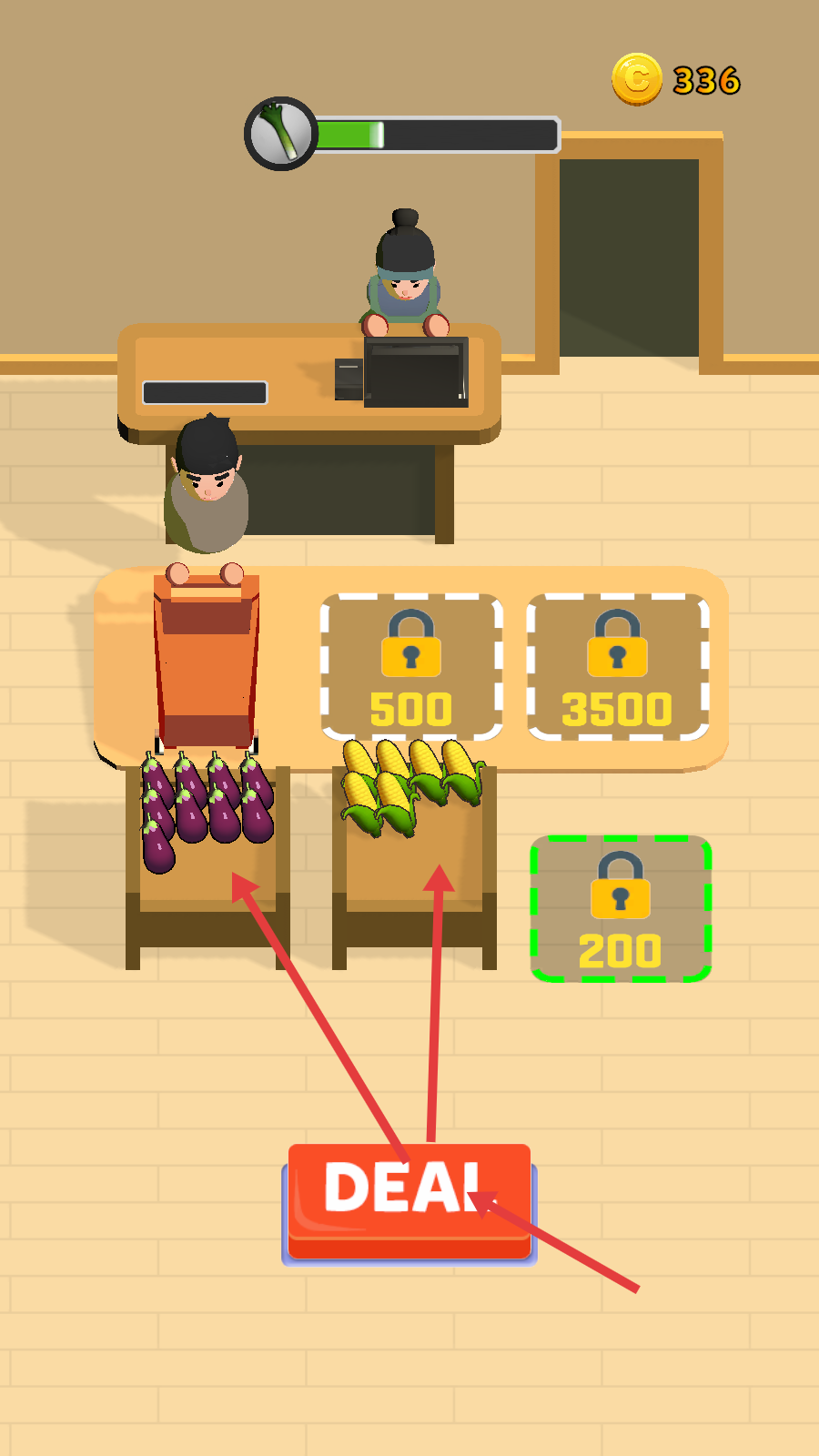 1、在超市中,选择【茄子】【玉米】等商品,点击【DEAL】按钮,开启商品交易流程,积累经营资源。