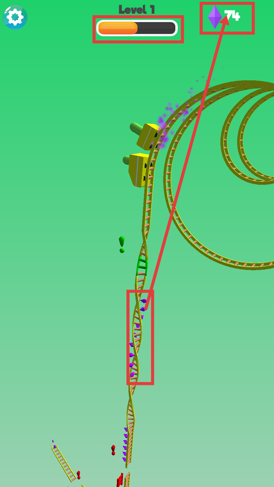 3、持续收集轨道上的紫色宝石,推进上方进度条,积累宝石数量至【74】,提升关卡完成度。