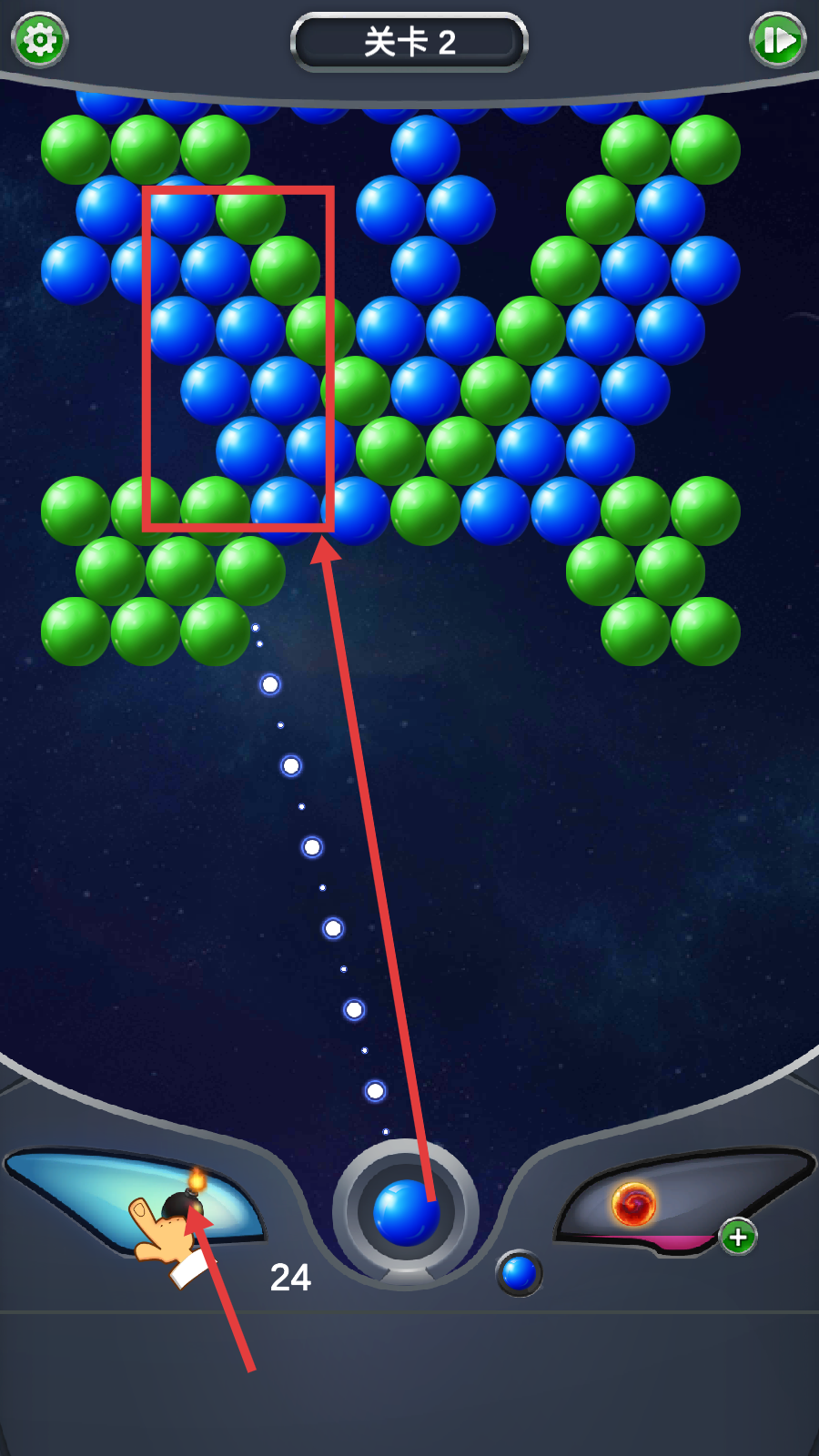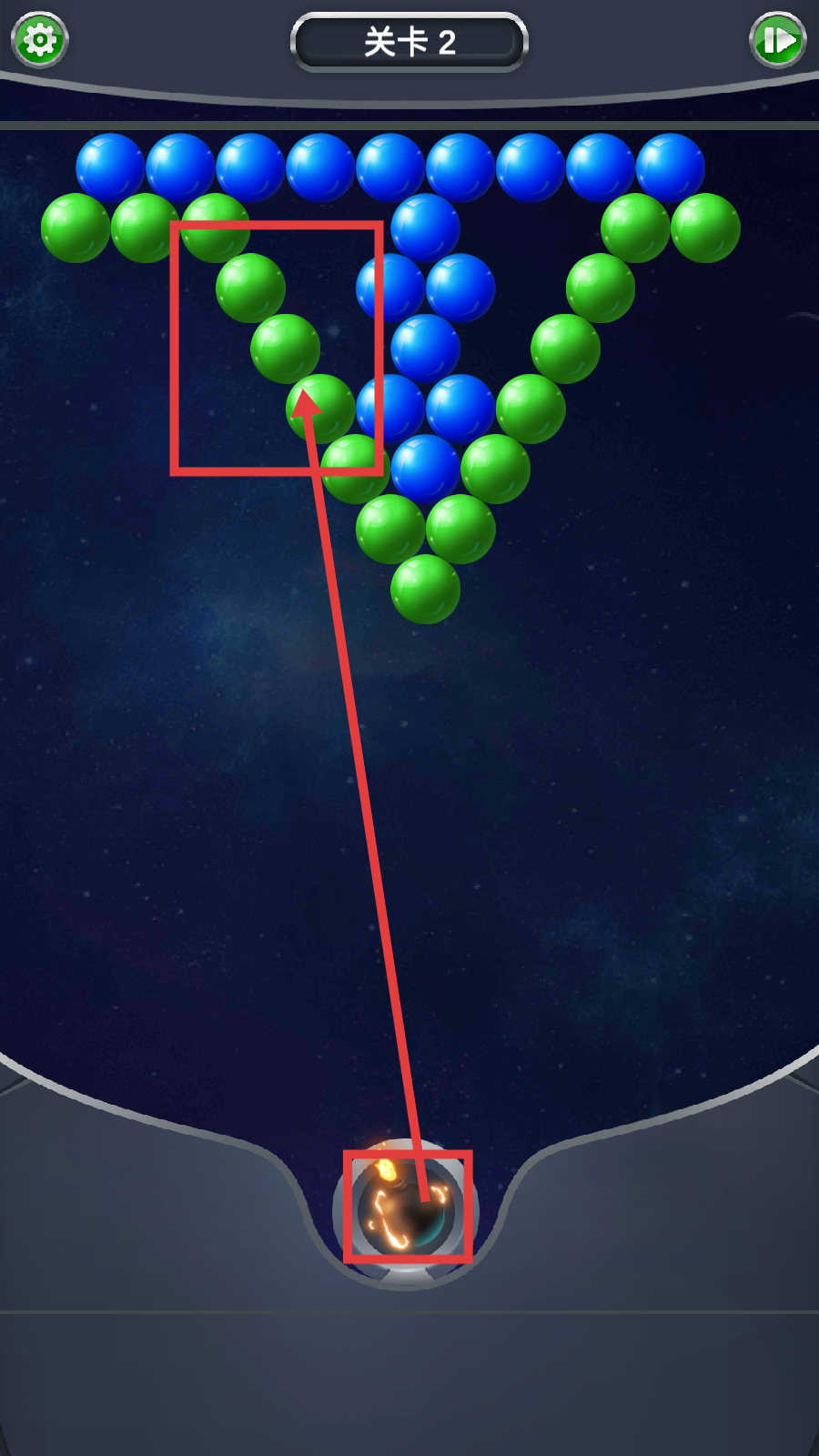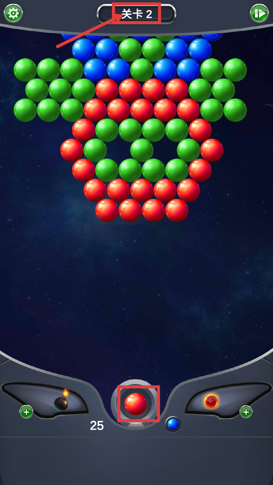 1、在【关卡2】时,发射【红色泡泡】瞄准下方红色泡泡群,通过同色消除逐步清理泡泡,推进关卡进程。