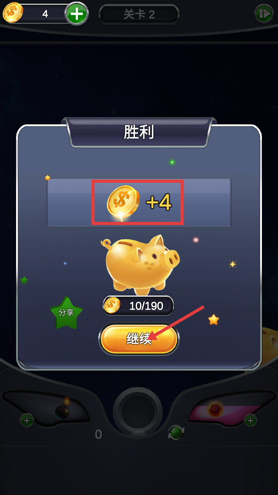 4、通关【关卡2】后获得【金币+4】,点击【继续】按钮可进入下一关,积累金币还可解锁更多游戏内容。