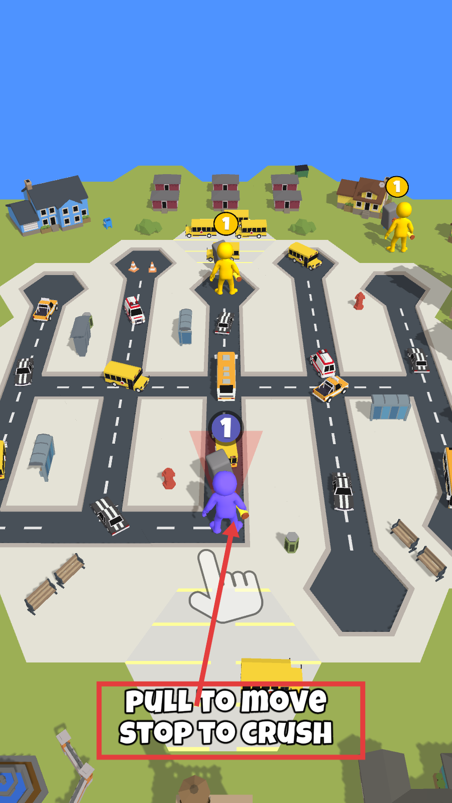 1、根据【PULL-TO-MOVE-STOP-TO-CRUSH】提示,拉动屏幕控制紫色巨人移动,掌握移动与破坏的操作逻辑,开启关卡挑战。