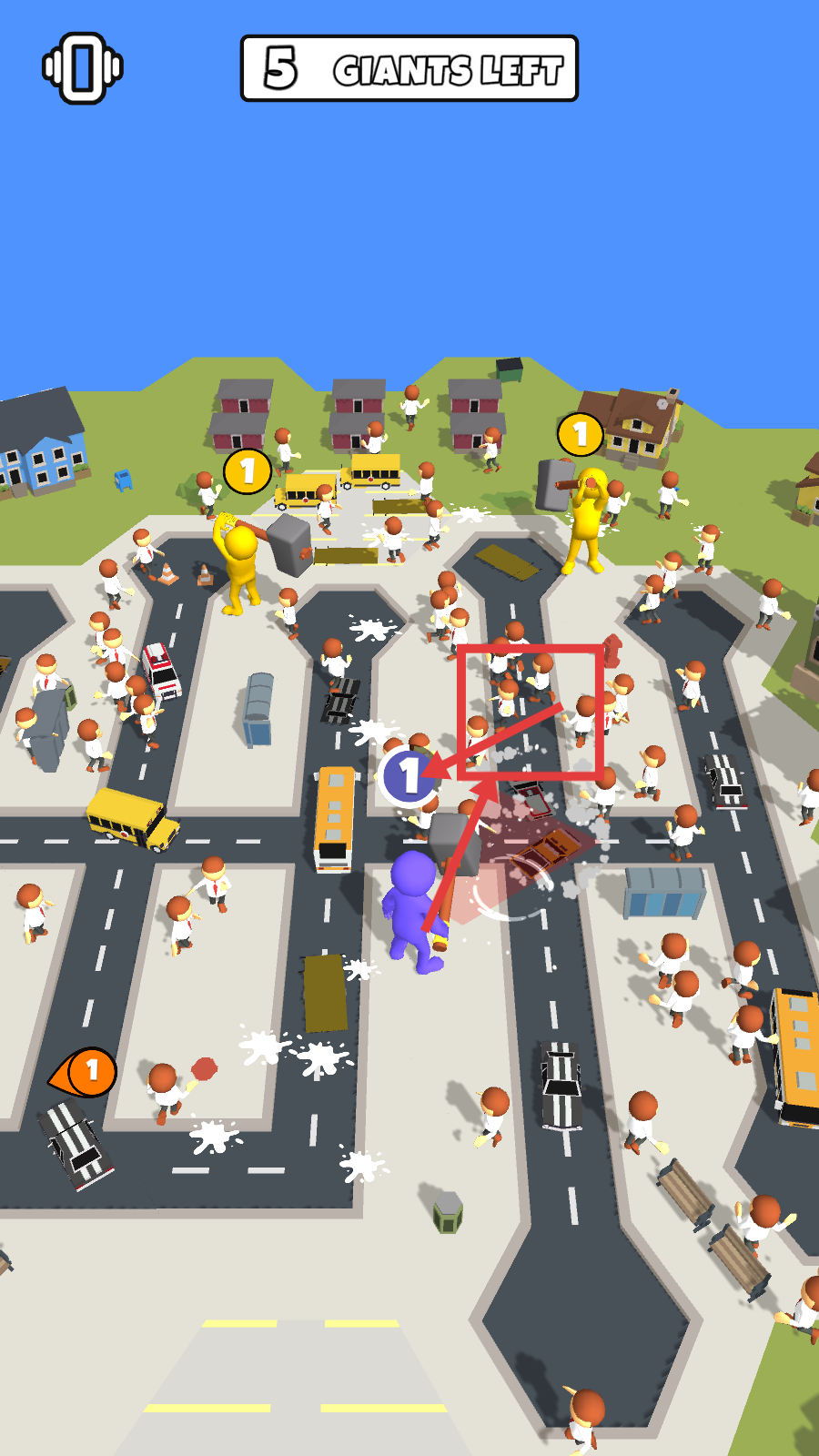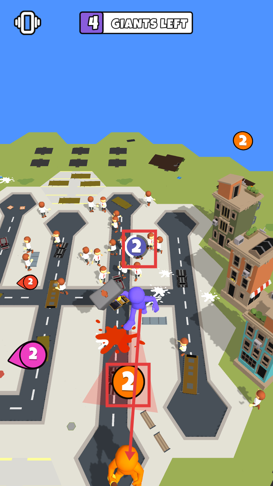 2、操控巨人攻击场景中的小人,逐步清理区域,减少【GIANTS-LEFT】的数量,推进关卡进度。