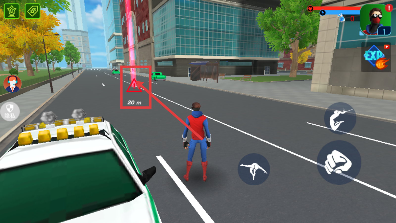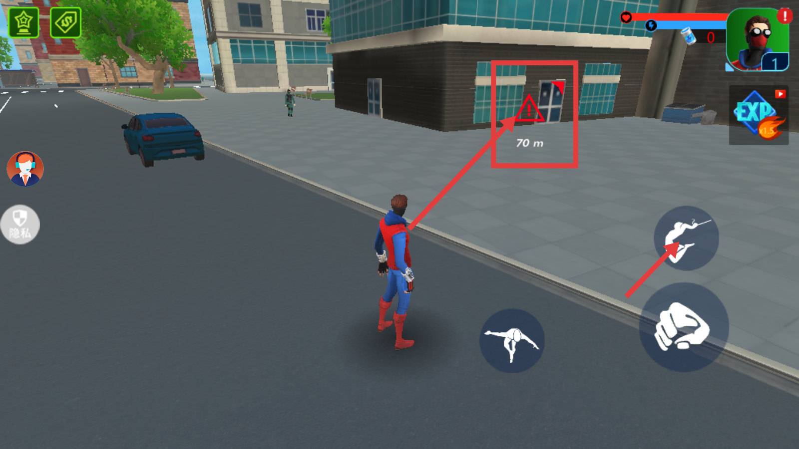 1、根据【任务标记-70m】移动角色,利用右侧技能按钮,准备前往任务点,开启城市冒险任务。
