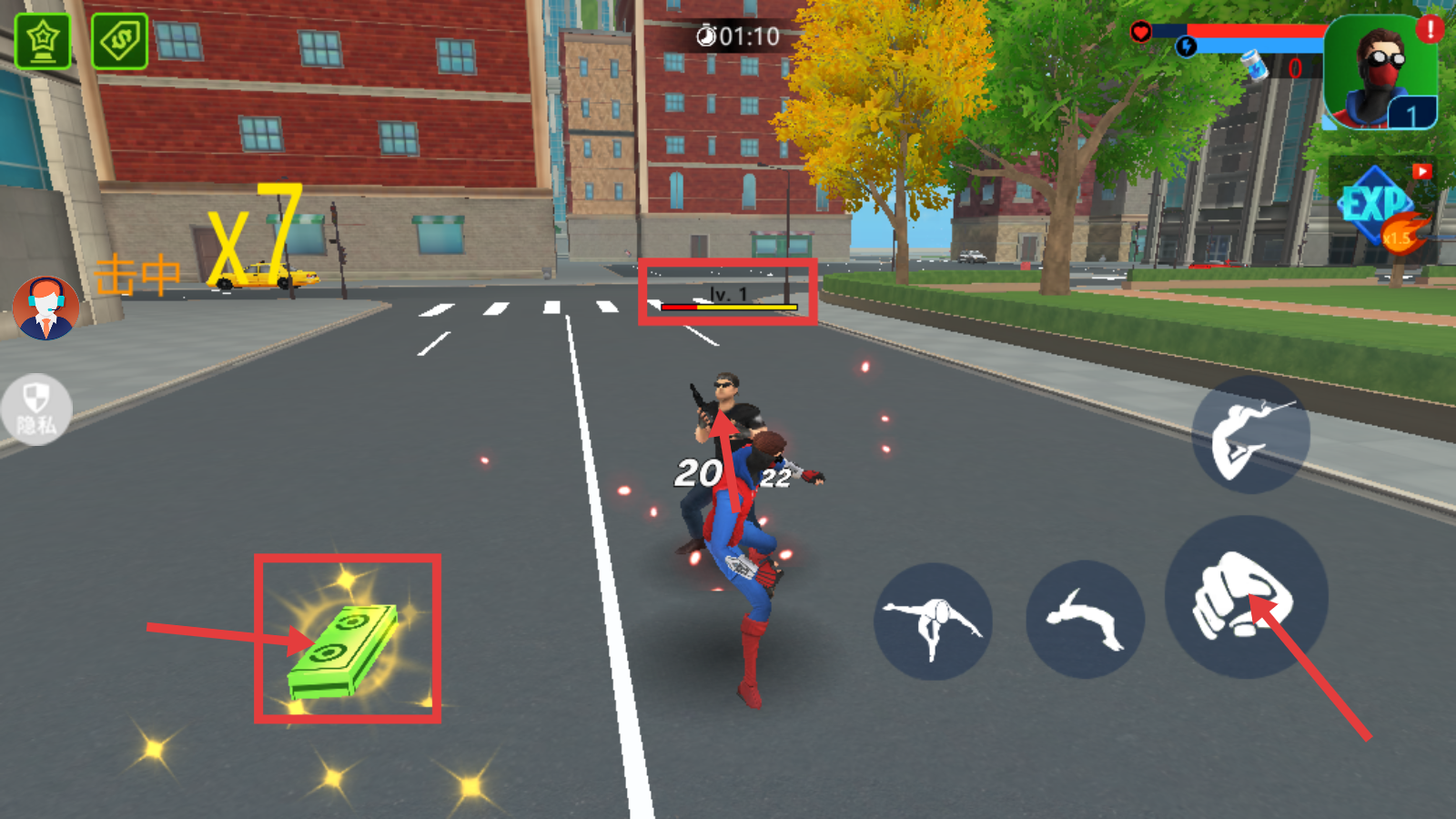 3、战斗中使用【拳头攻击】技能,击败【lv.1】敌人,同时收集金币,提升角色等级与战力。