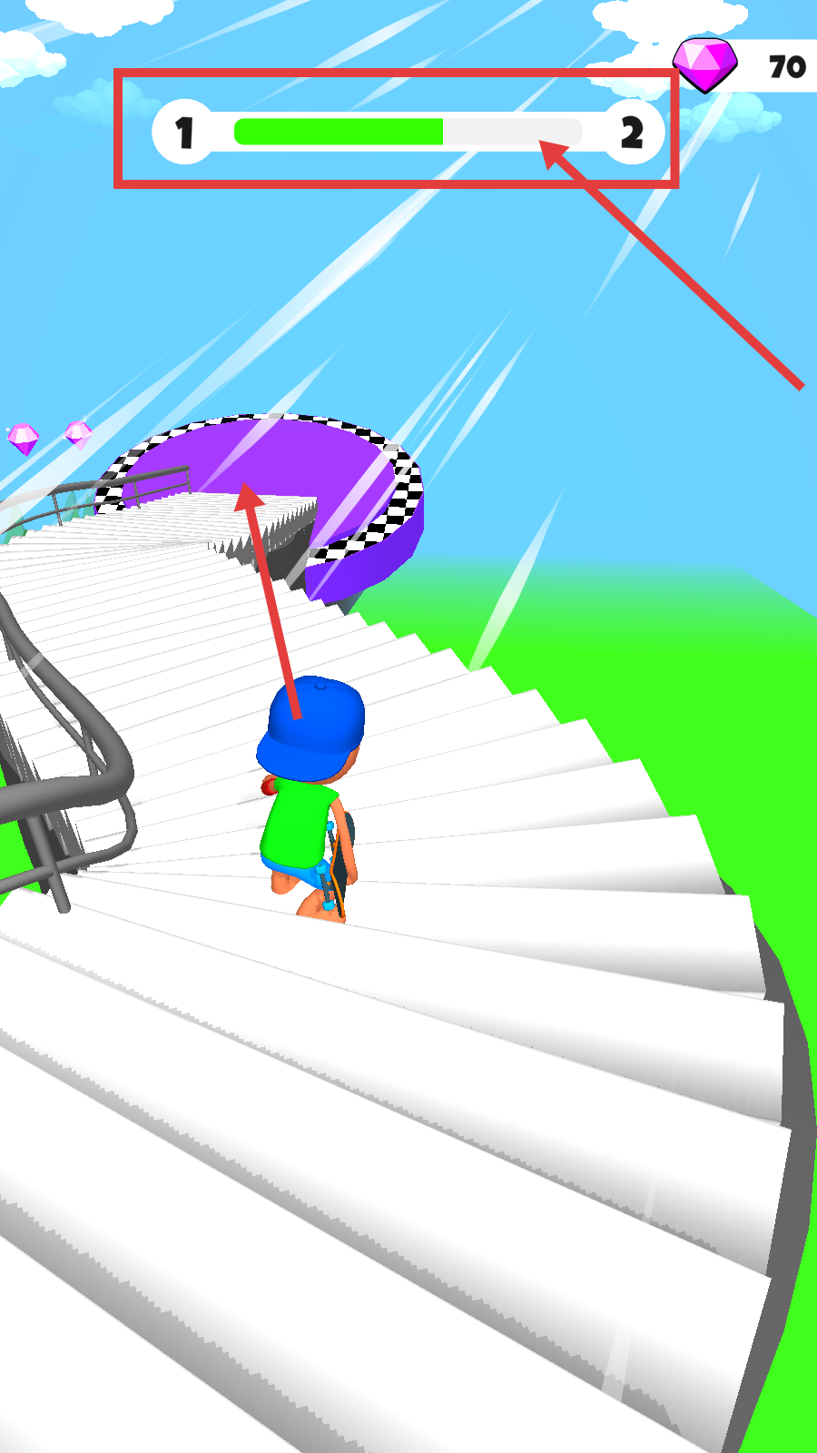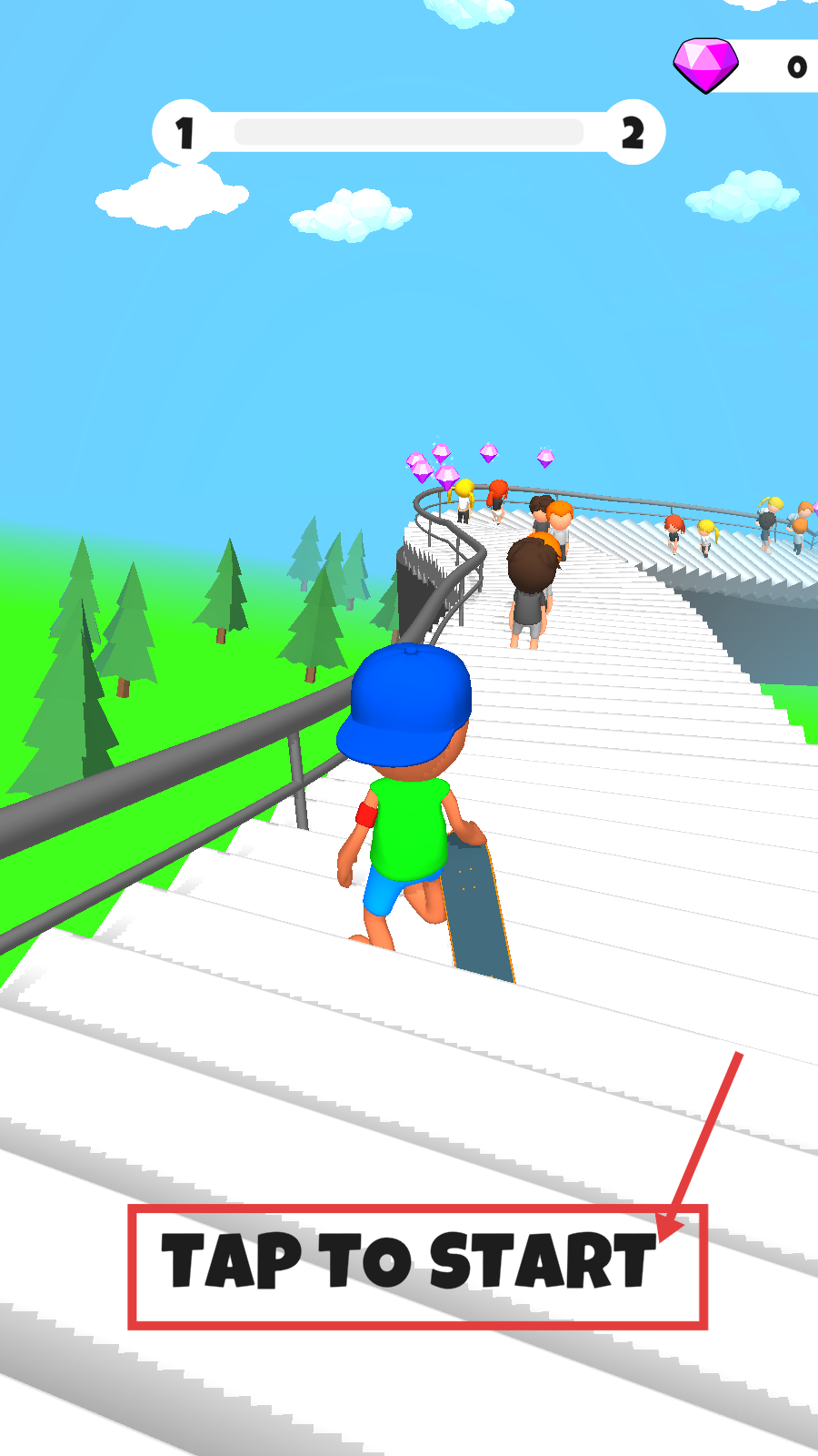 1、点击【TAP-TO-START】开始游戏,操控滑板角色踏上阶梯赛道,开启跑酷挑战之旅。