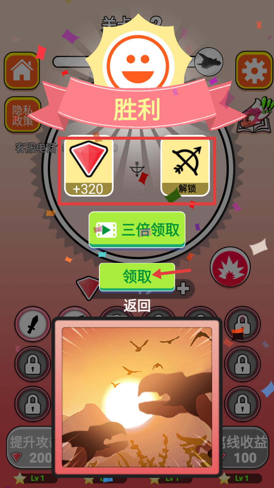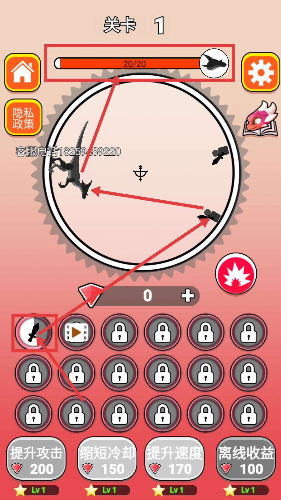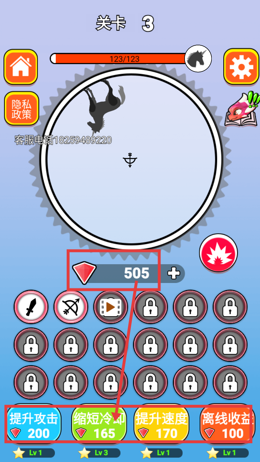 4、在【关卡3】,消耗钻石升级【提升攻击】【缩短冷却】等属性,增强战力,高效屠龙。