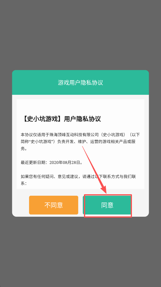 1、首先,阅读并同意《用户隐私协议》,点击“同意”按钮以进入游戏。