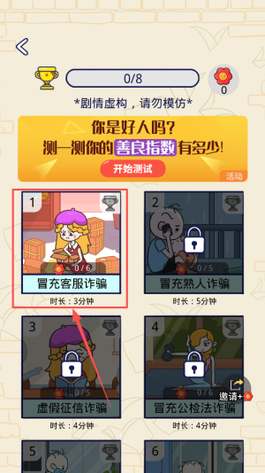 1、开启剧情挑战:进入游戏选择关卡,明确 “识破诈骗套路、完成逃离” 目标,熟悉剧情互动与线索寻找的基础逻辑。