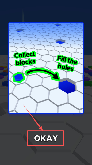 2、接着,理解游戏的基本操作,即收集方块并填补地面的空洞,点击“OKAY”确认。