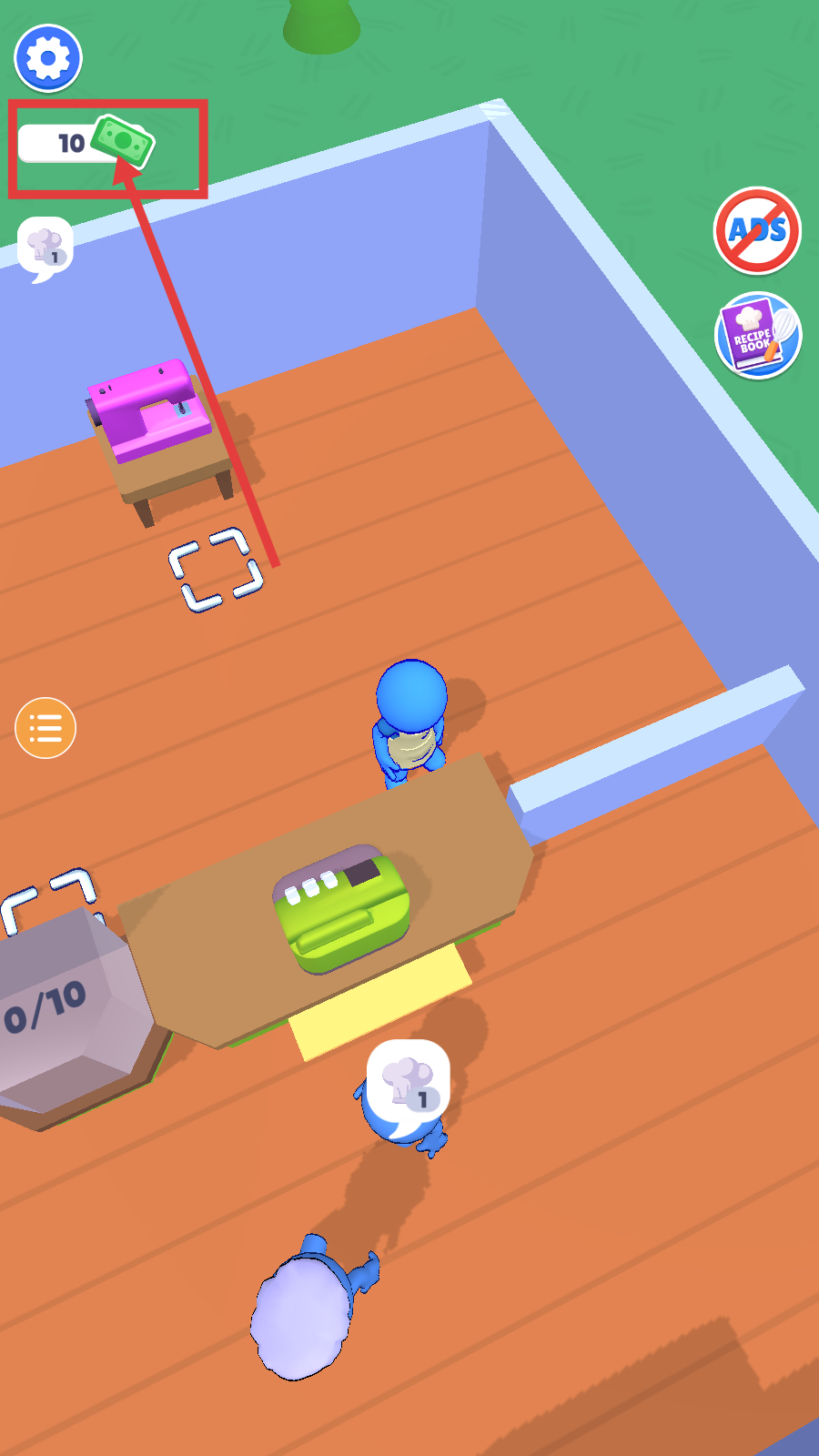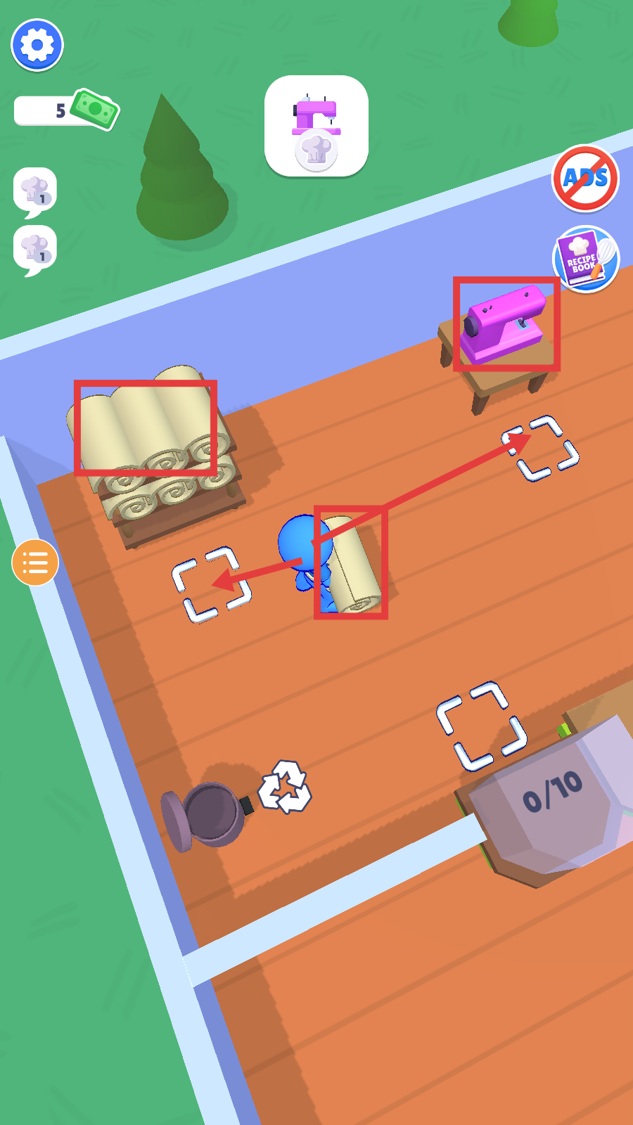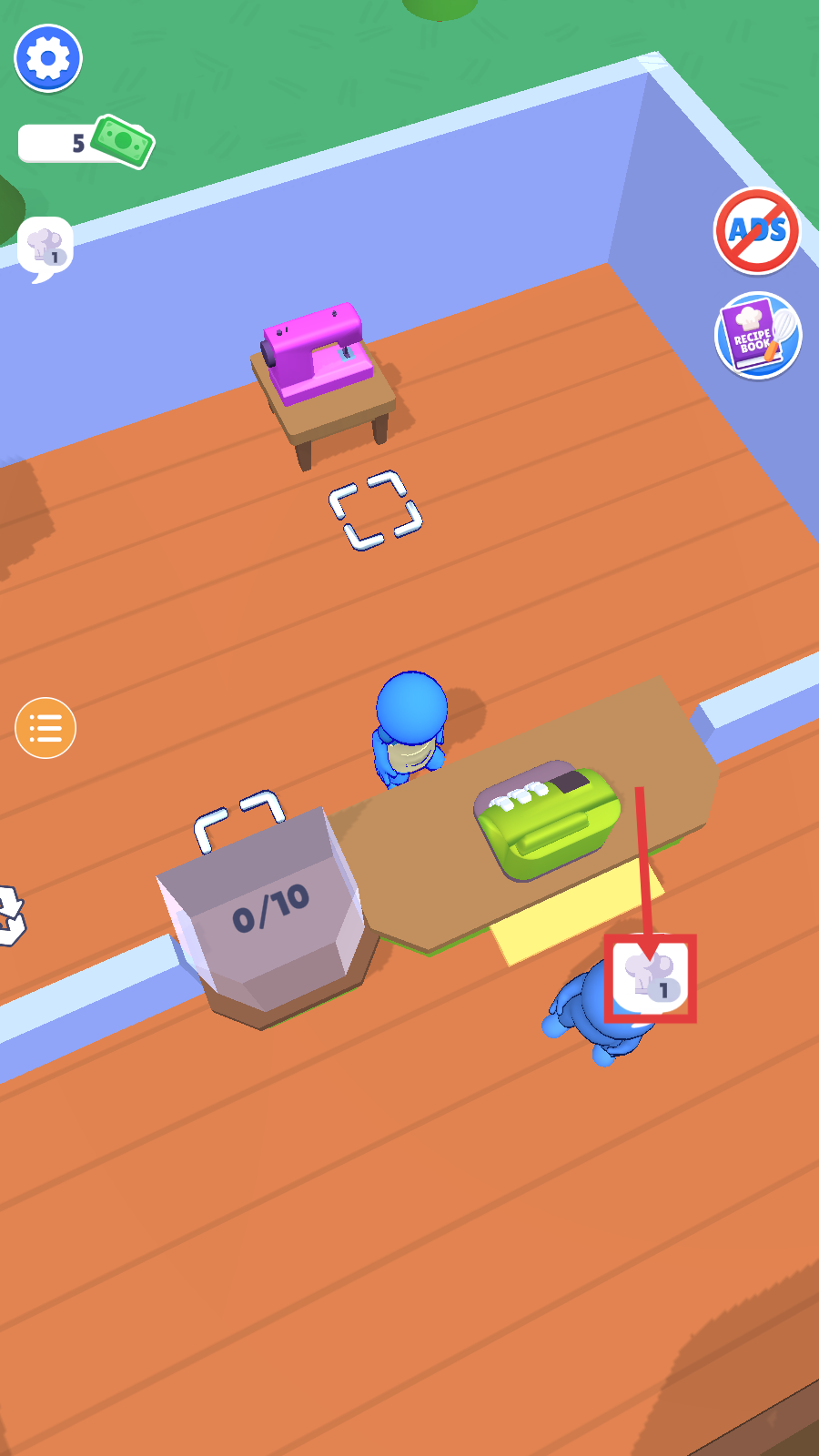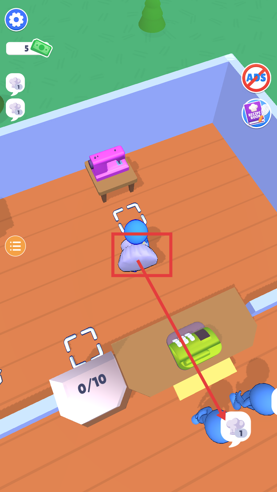1、进入工坊场景后,留意角色的任务提示(如厨师图标),初始拥有少量金钱(5),开启工坊经营流程,为后续生产积累基础资源。