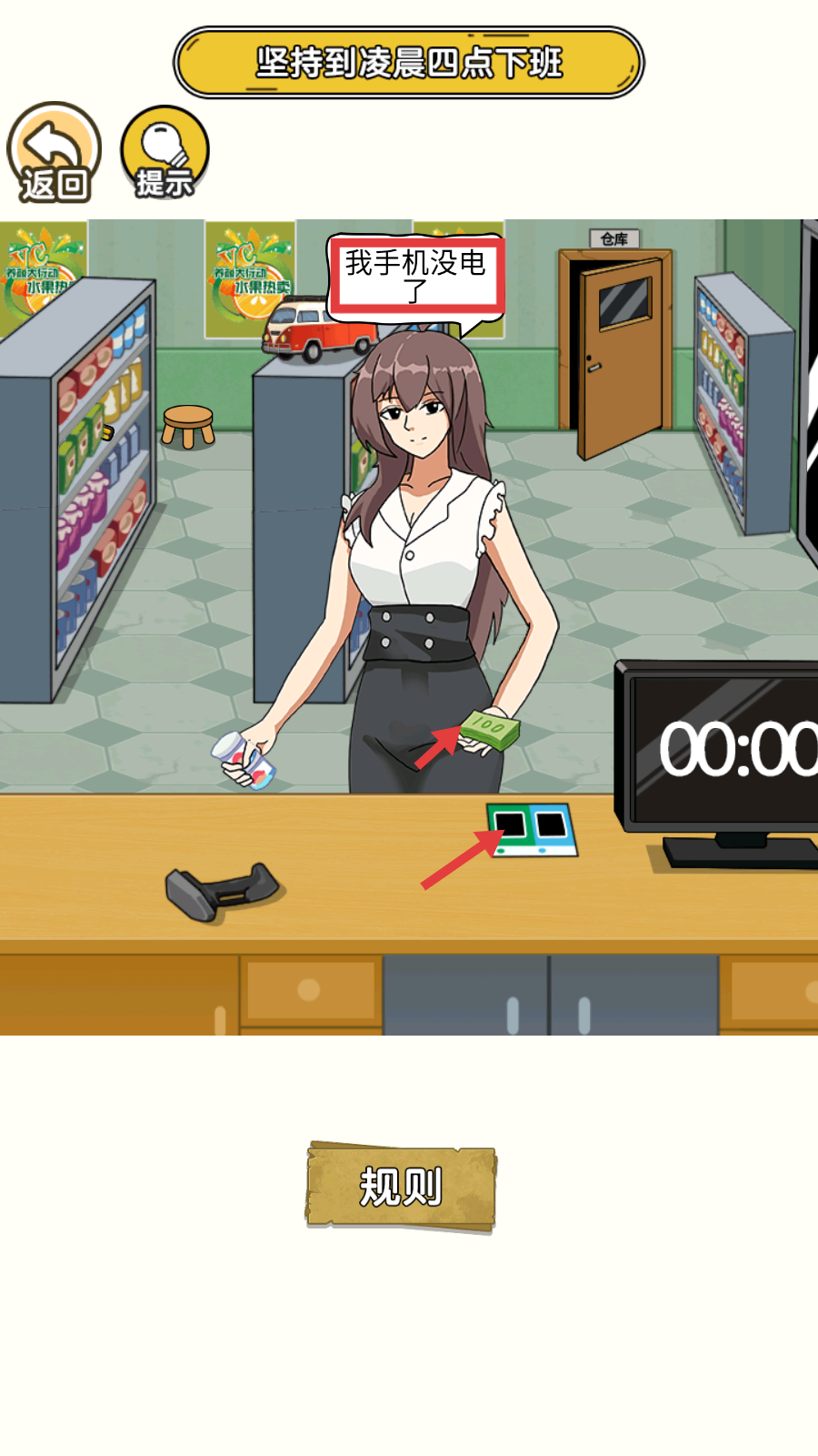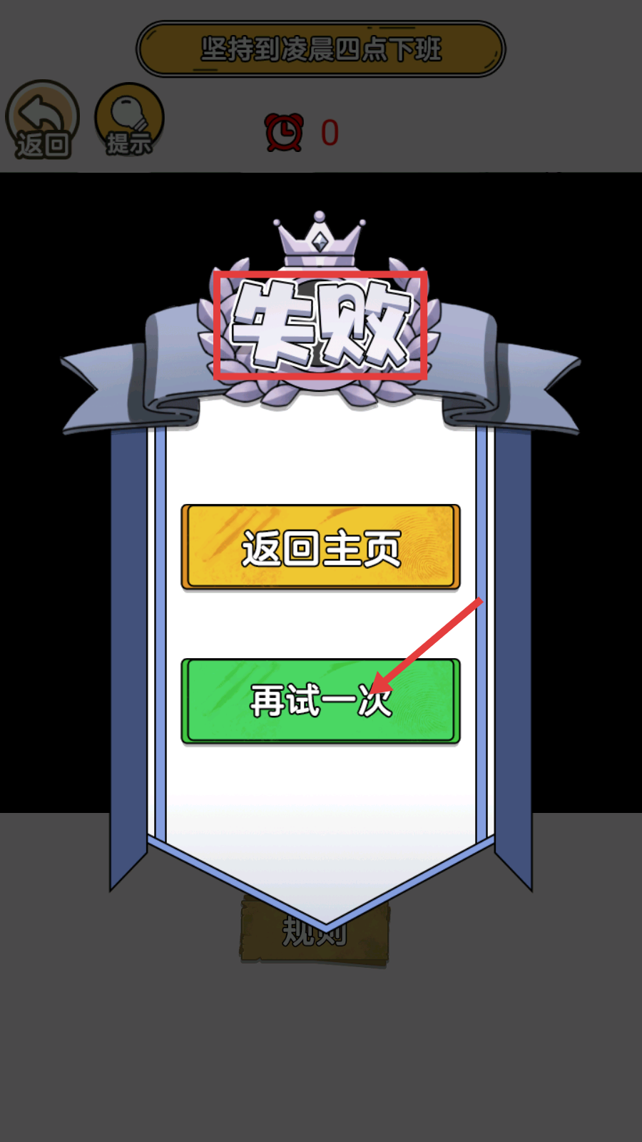 4、若挑战失败,点击“再试一次”重新开始,总结失败原因,严格遵守规则,争取成功坚持到凌晨四点下班。