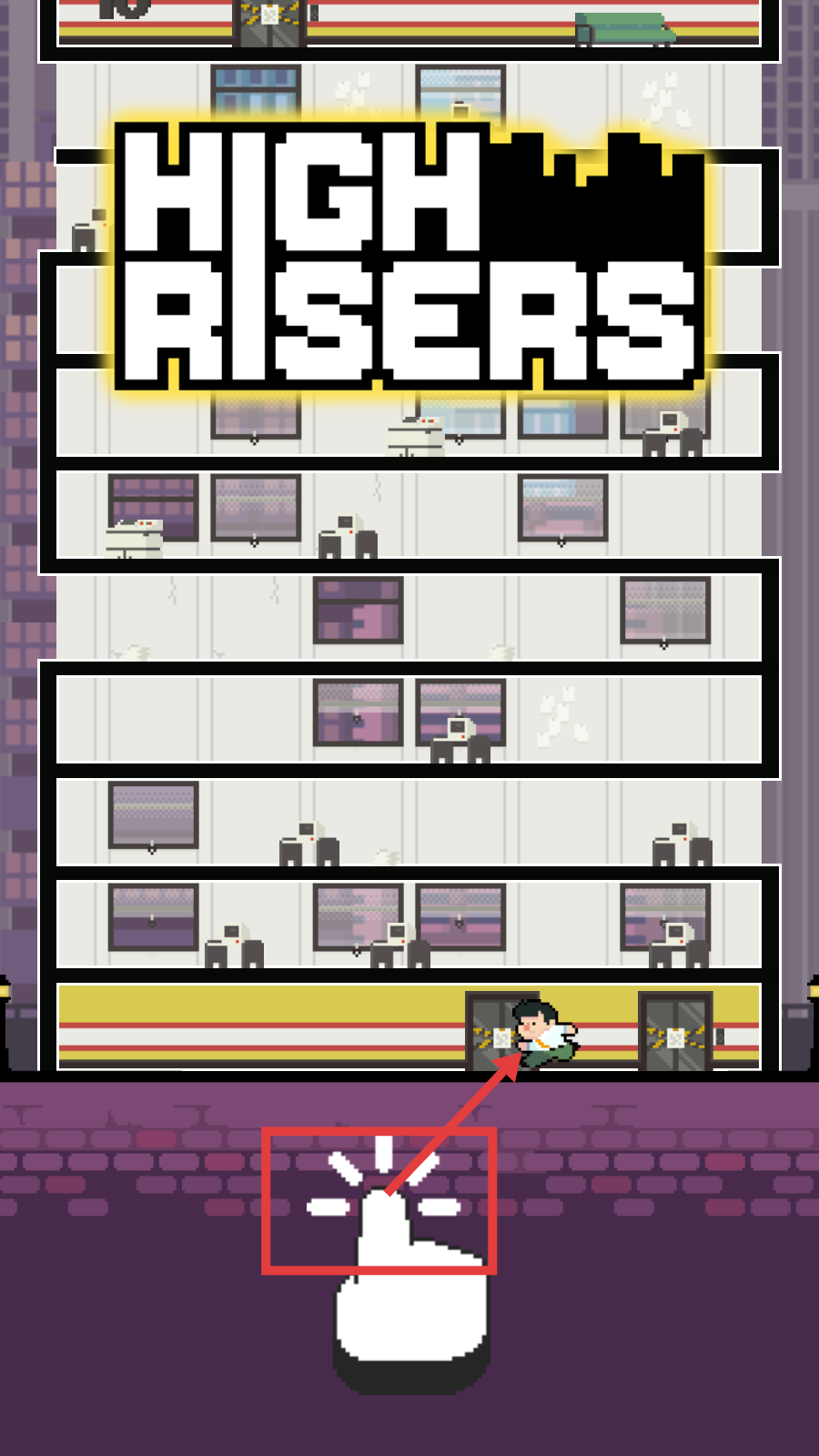 1、开始游戏时跟随提示操作,熟悉【HIGH-RISERS】的基本玩法,通过点击屏幕控制角色移动,开启攀爬冒险。