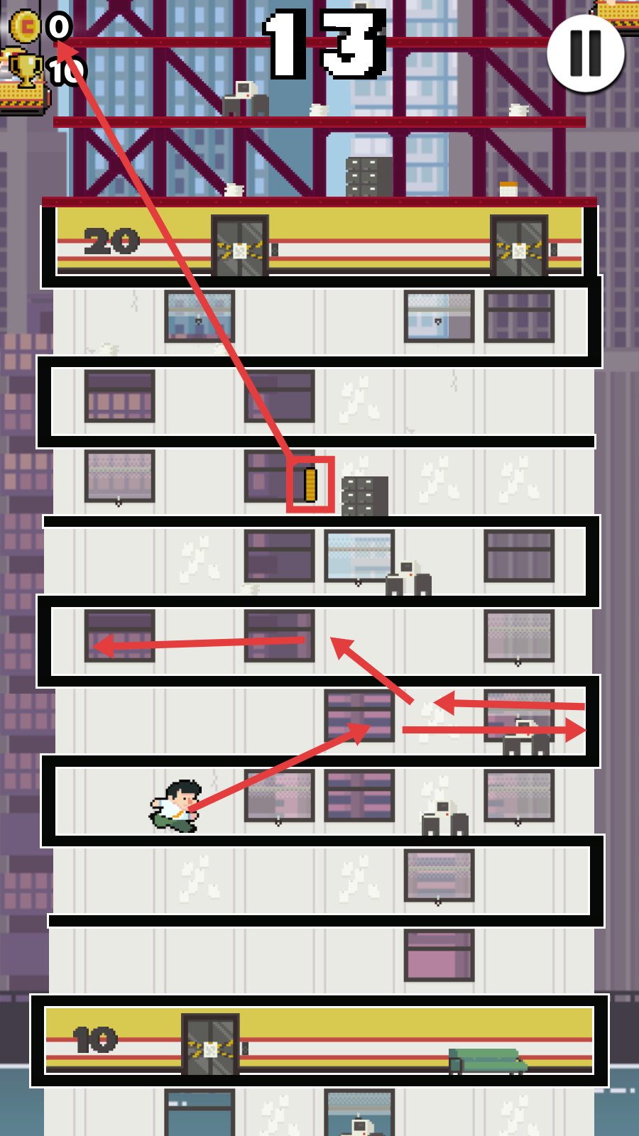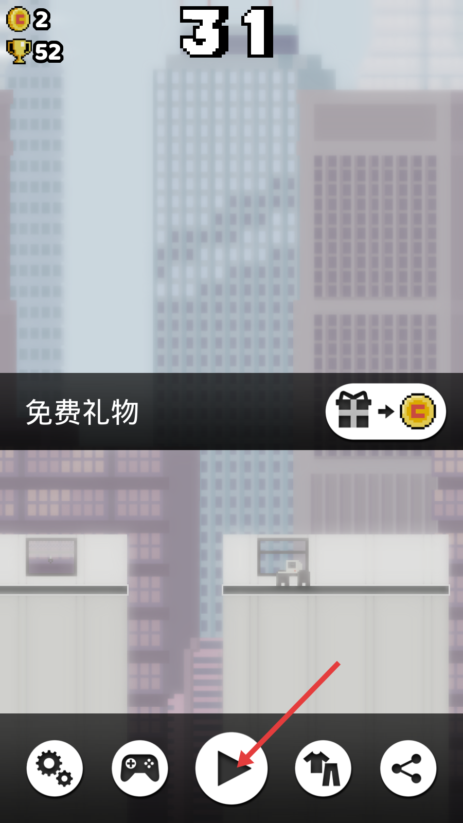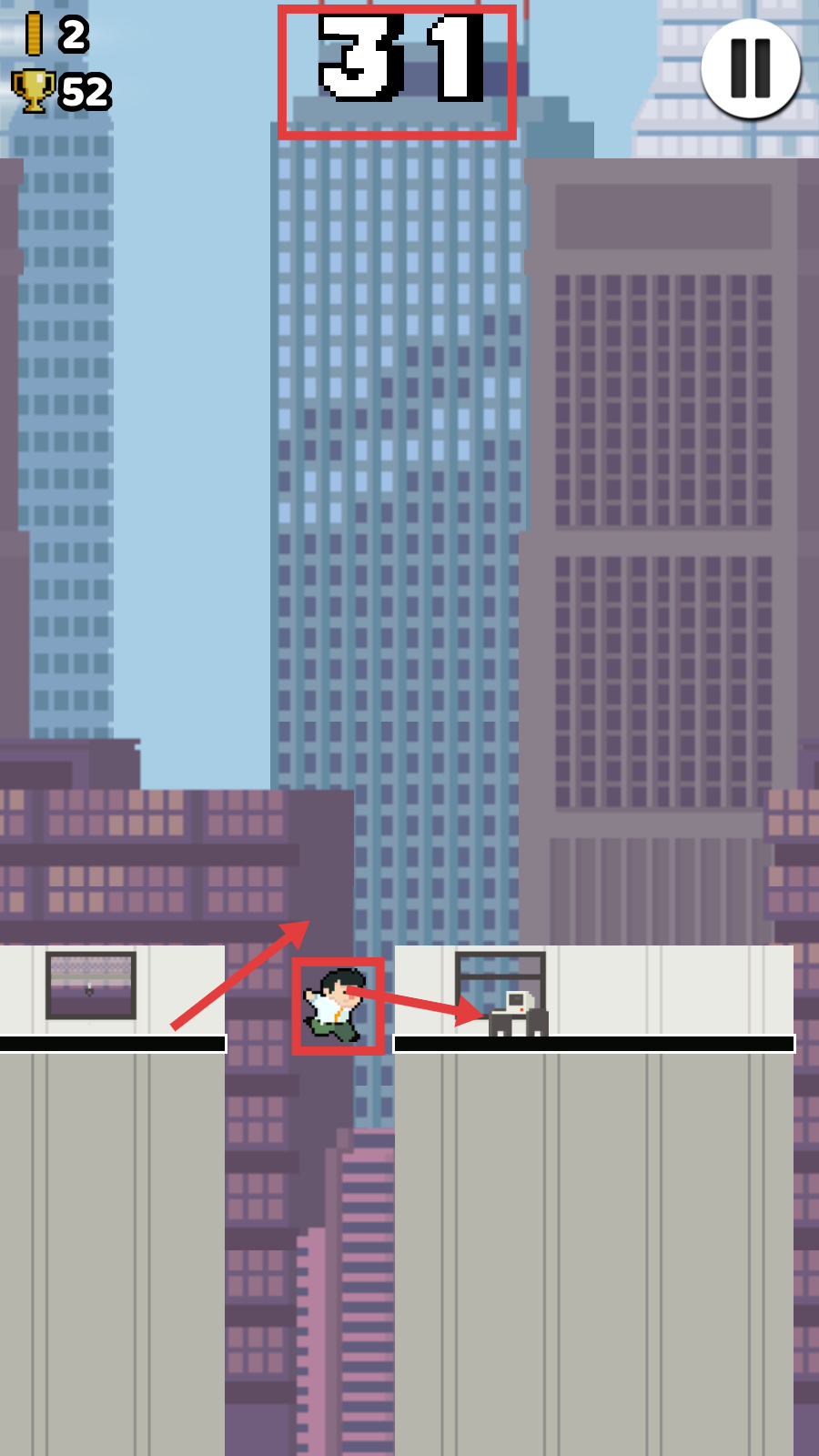 3、遇到建筑间隙时,把握时机跳跃,保持角色移动节奏,争取达到更高的【31】分数或楼层,提升游戏成绩。
