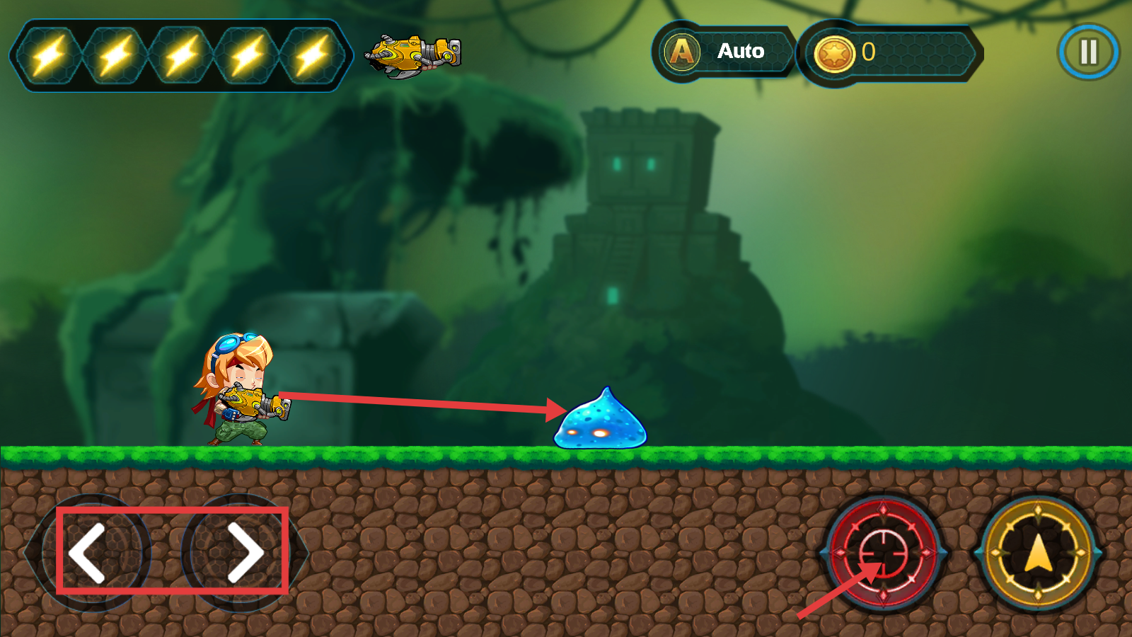 2、战斗时通过方向键控制角色移动,瞄准敌人如蓝色史莱姆,点击射击按钮发起攻击,推进关卡。