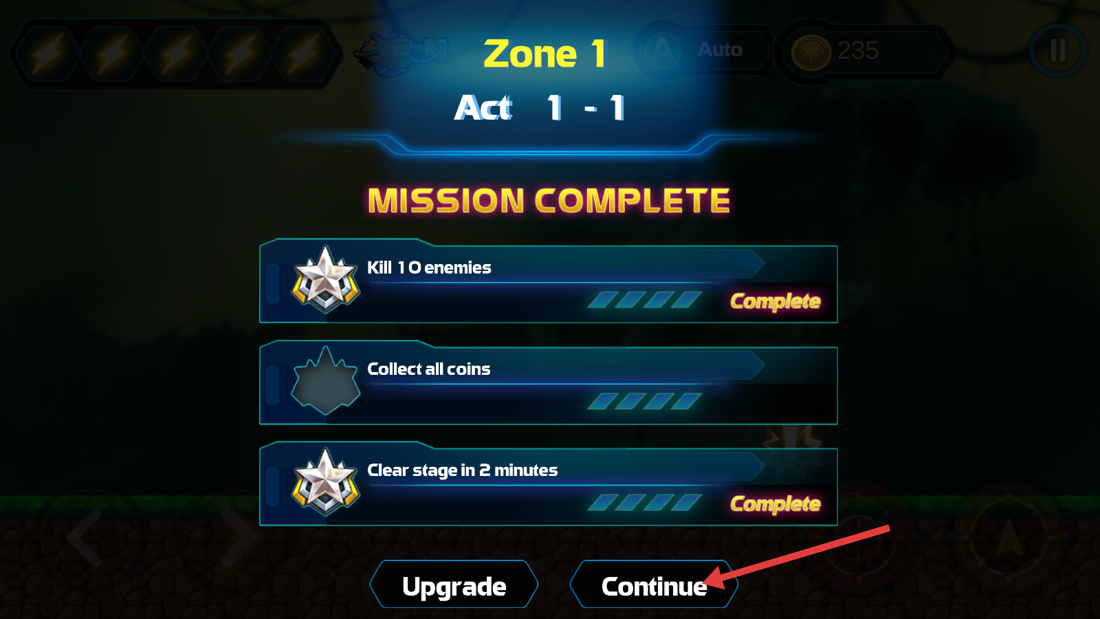 4、完成【Zone-1-Act-1-1】任务后,点击【Continue】按钮,继续挑战下一个关卡,不断提升战斗技巧和资源积累。