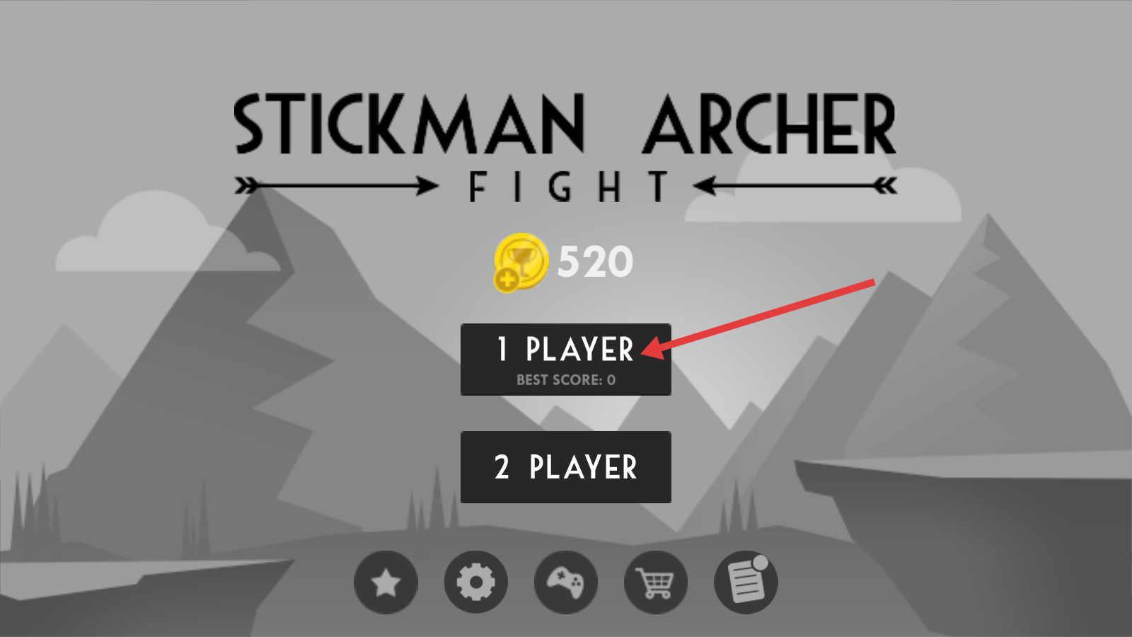 1、进入【Stickman-Archer-Fight】游戏,选择【1-PLAYER】模式,开启单人射箭战斗之旅。