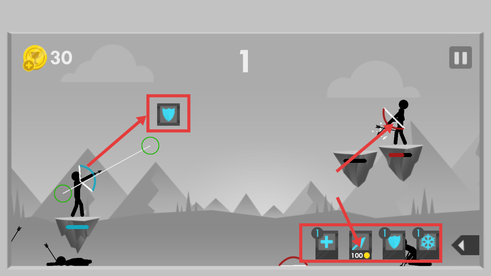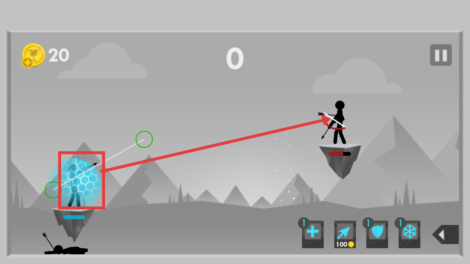 2、战斗时利用蓝色护盾保护自己,瞄准敌方火柴人,精准射箭发起攻击,逐步削减其血量。