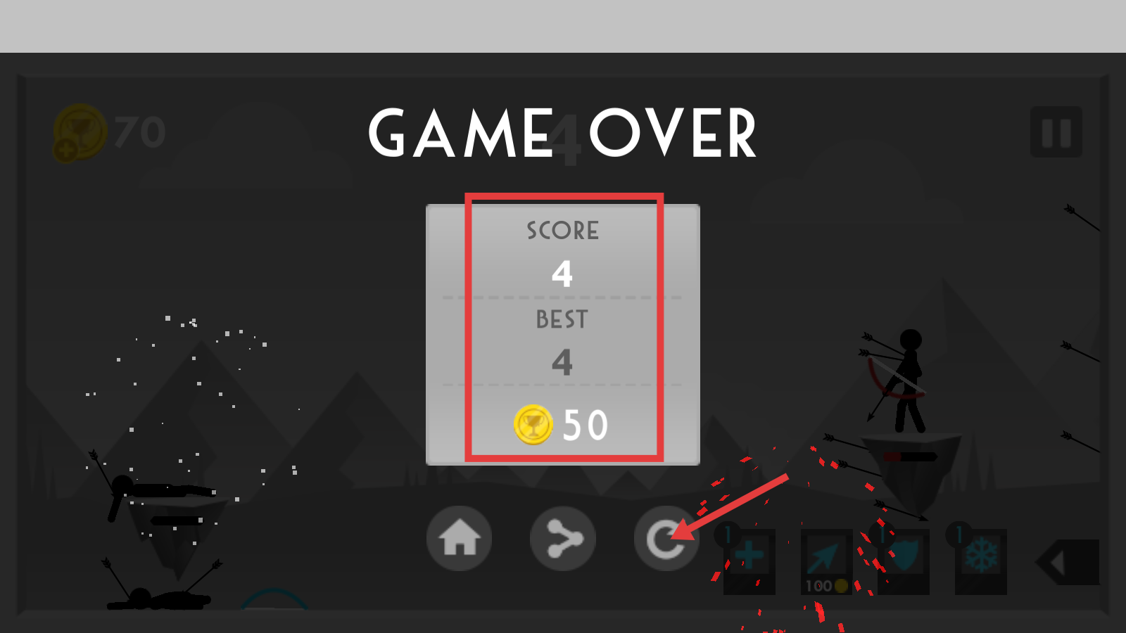 4、游戏结束后查看【SCORE-4】【BEST-4】【50金币】的战斗统计,点击重来按钮,继续挑战以提升成绩。