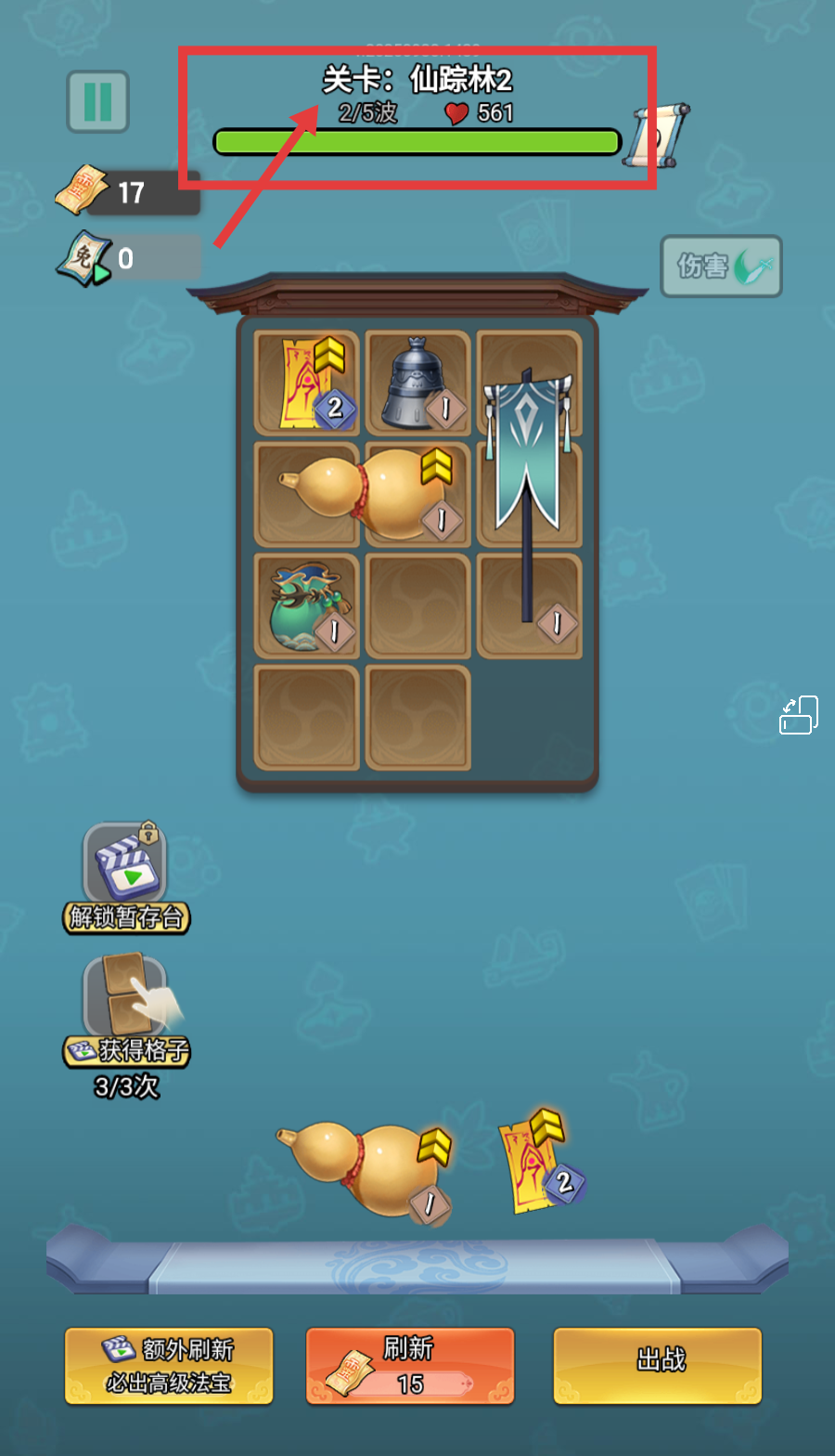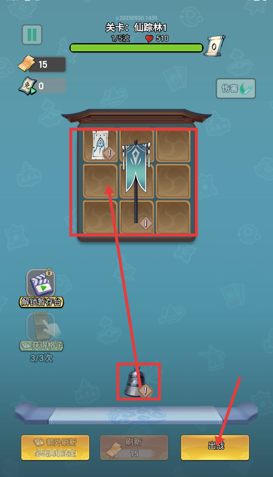 1、在【关卡-仙踪林1】1/5波时,将【铃铛】等法宝放入格子,点击【出战】,开启战斗。