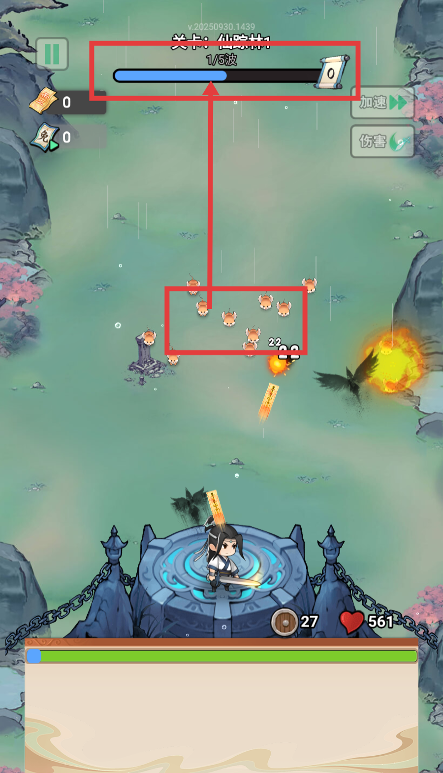 3、战斗时留意【关卡-仙踪林1】的波数进度,持续清理怪物,推进【1/5波】的关卡进度。