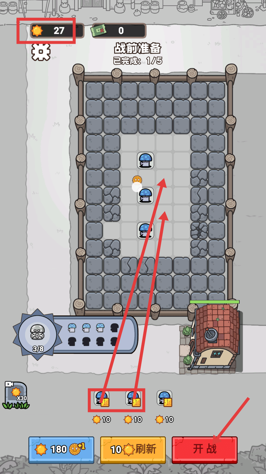 1、战前准备阶段,消耗【27阳光】布置蘑菇,完成1/5进度后,点击【开战】开启战斗。