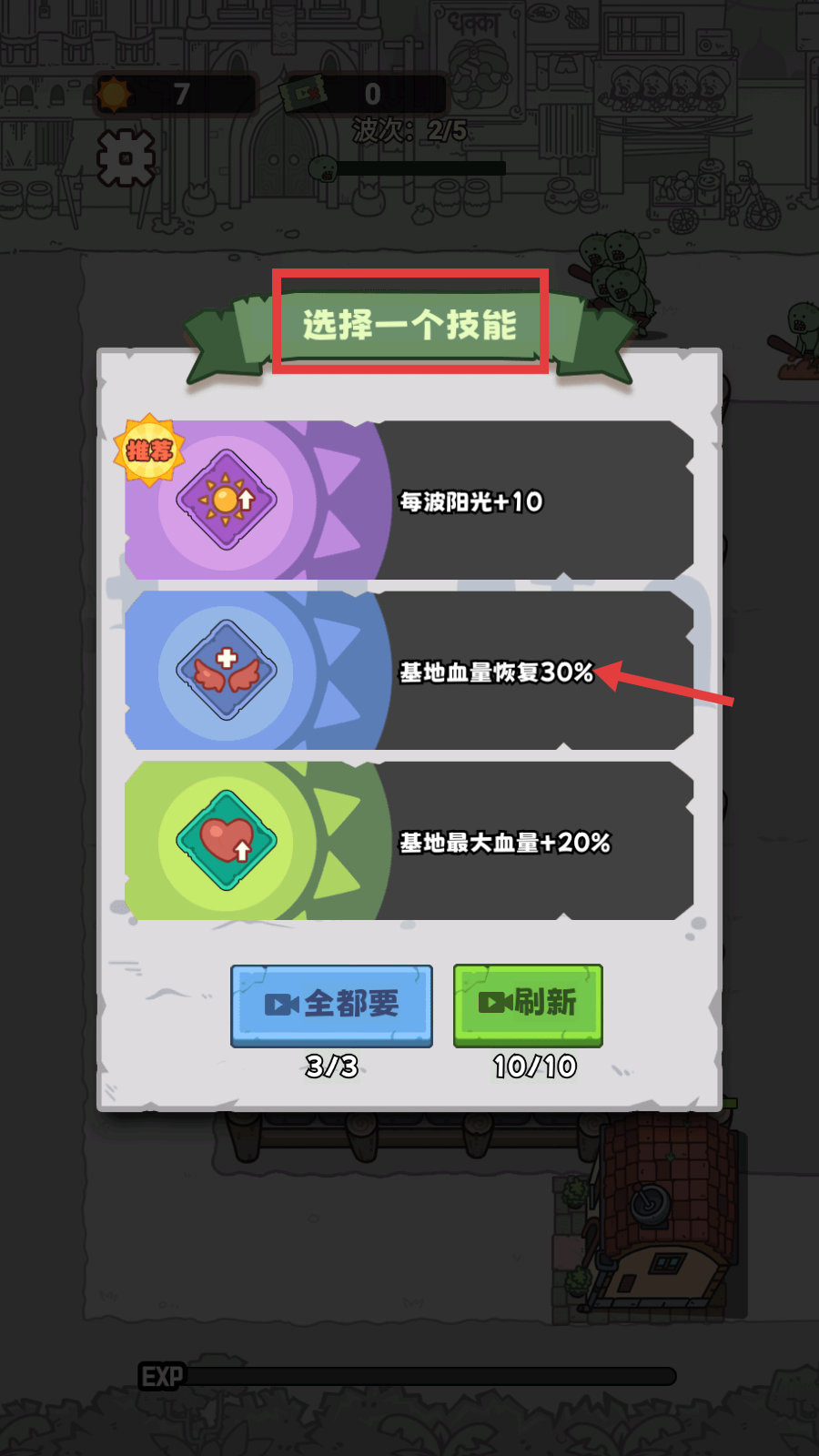 2、波次2/5时,选择【基地血量恢复30%】技能,增强基地续航能力,应对后续怪物波次。