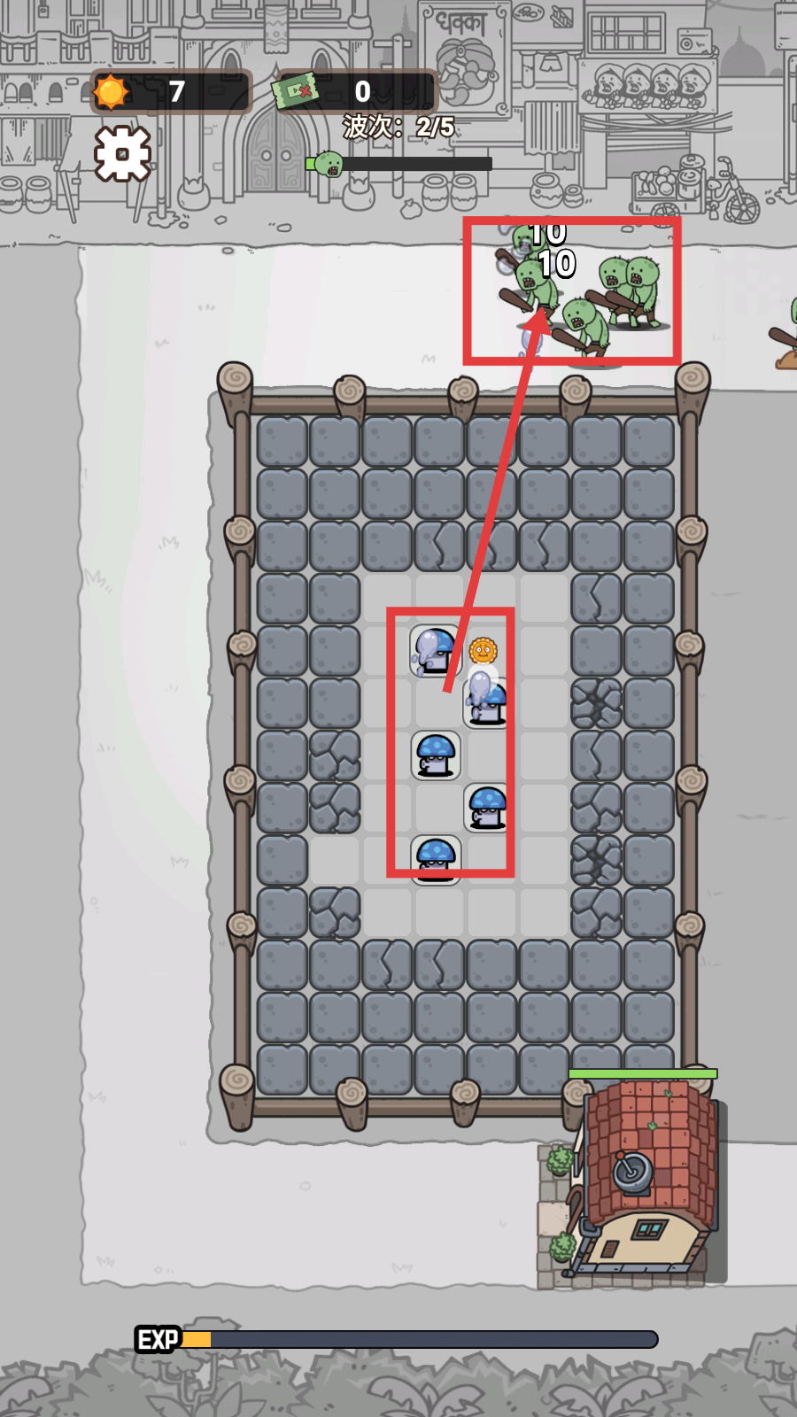 3、战斗中,操控蘑菇攻击【绿色怪物-10/10】,合理布局防御,逐步清理怪物推进进度。