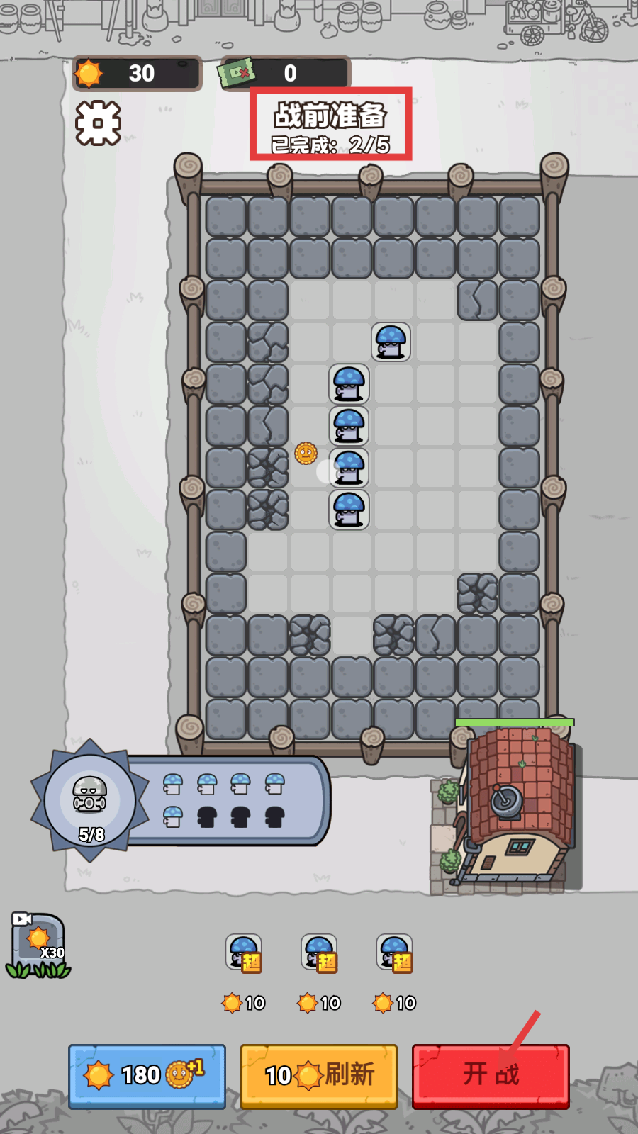 4、战前准备完成2/5,布置蘑菇后点击【开战】,继续挑战波次,积累阳光以强化防御。