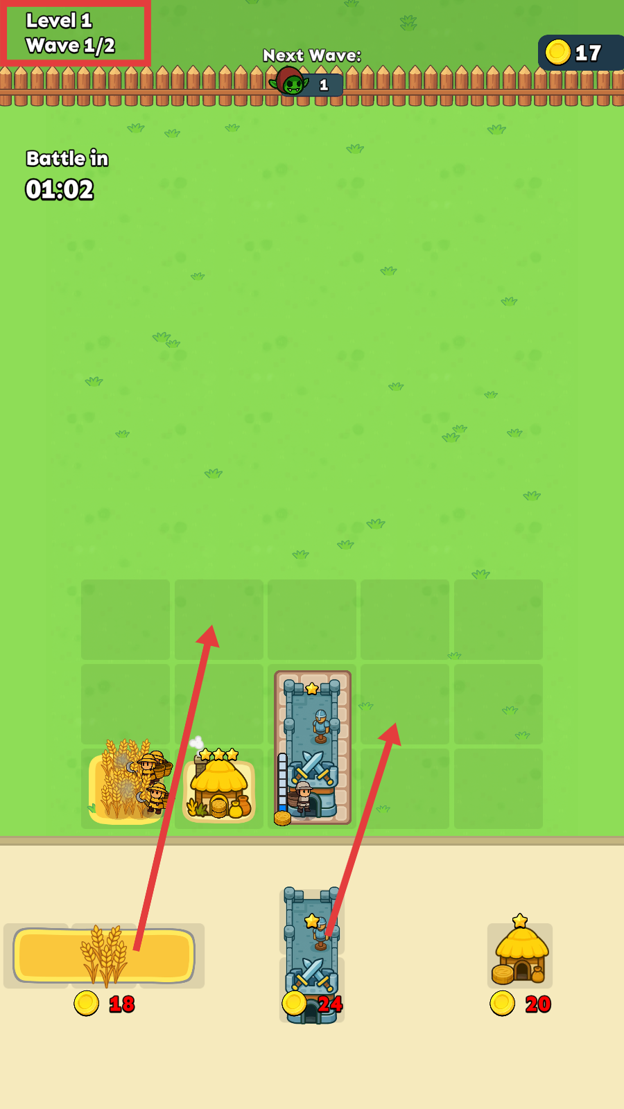 1、在【Level-1-Wave-1/2】阶段,布置小麦和建筑,积累金币,为后续战斗的士兵招募与建筑升级做准备。