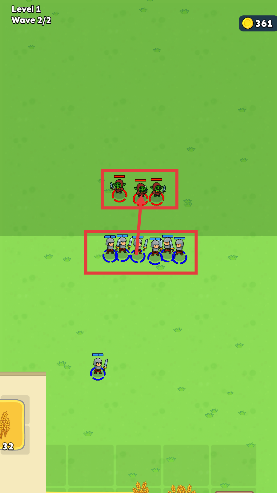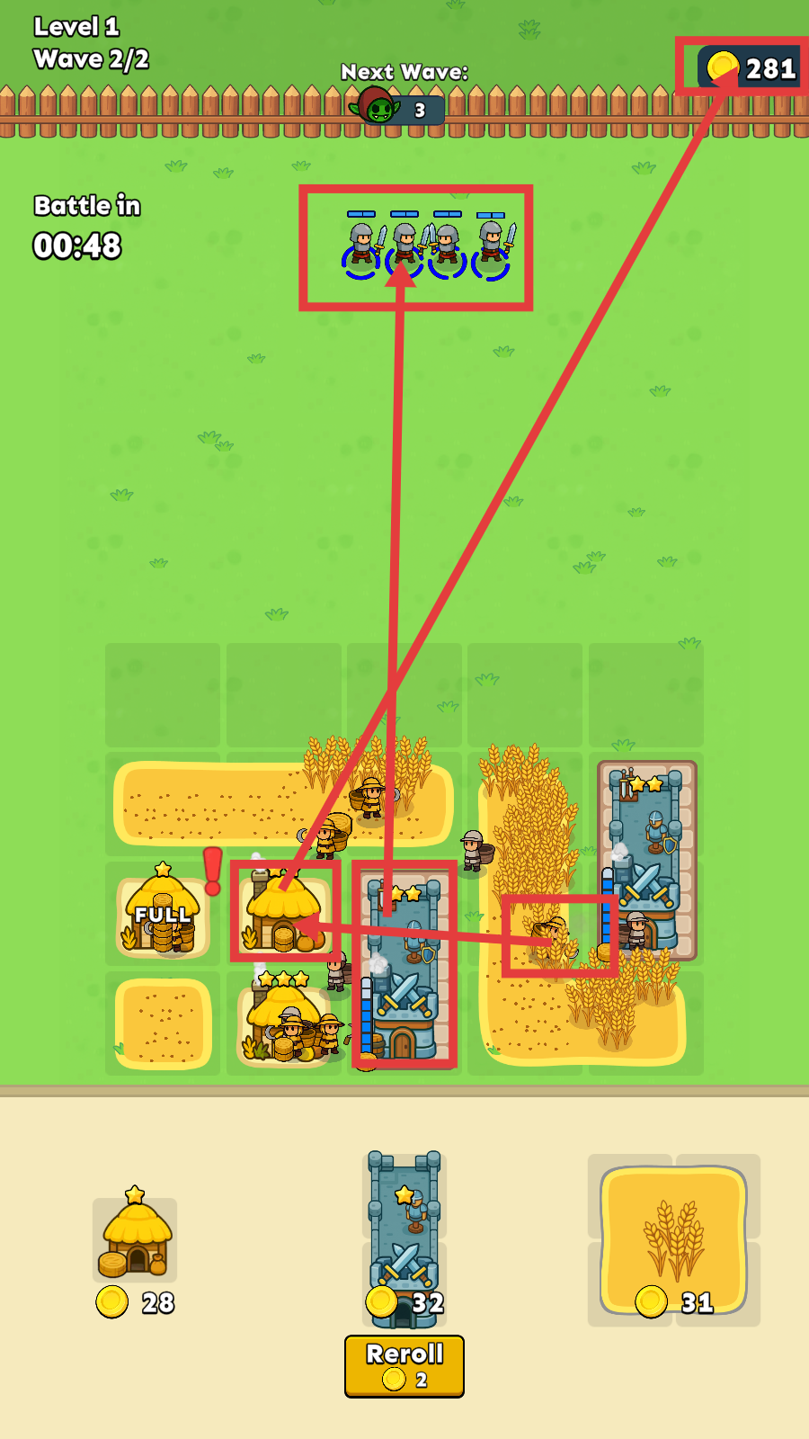 2、【Level-1-Wave-2/2】时,利用积累的281金币,升级建筑并招募士兵,提升战力以应对3个哥布林。