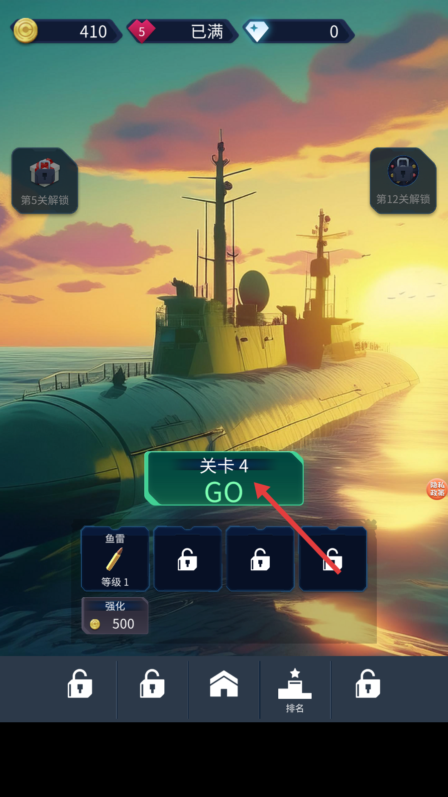 1、在【关卡4】界面,点击【GO】,驾驶潜艇开启第4关海战挑战,准备用鱼雷攻击敌方战舰。