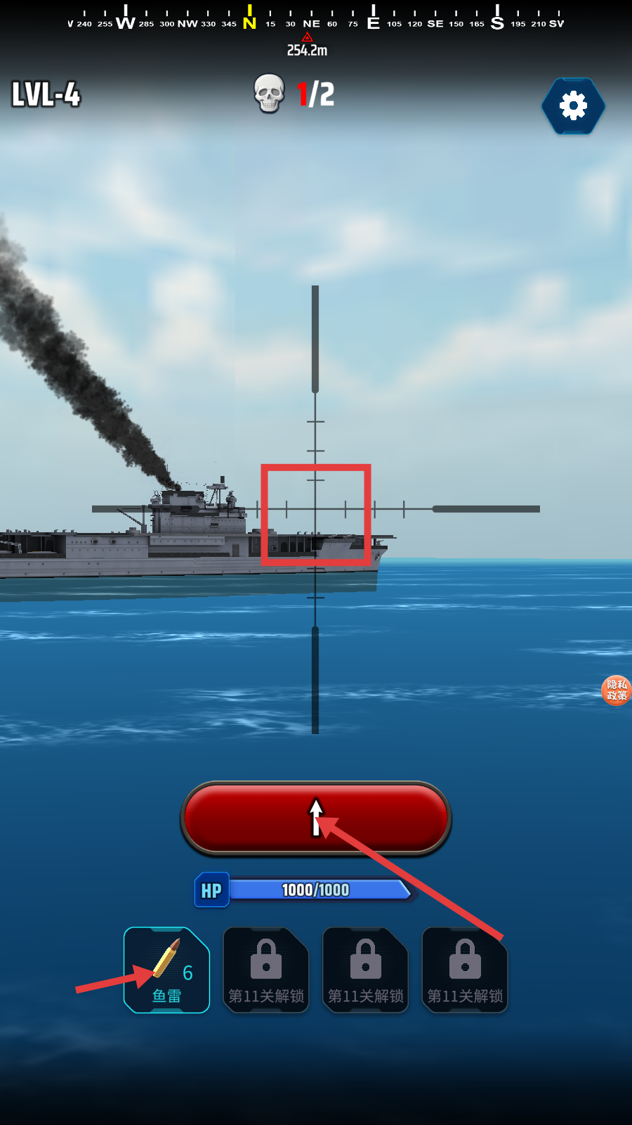 2、【LVL-4】战斗中,瞄准敌方战舰,使用【鱼雷-6】,点击红色攻击按钮,发起首轮攻击。