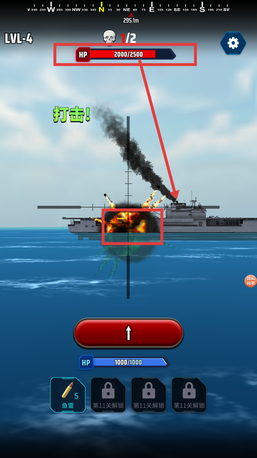 3、攻击命中后,敌方战舰【HP-2000/2500】,持续打击可削减其血量,推进【LVL-4】战斗进度。