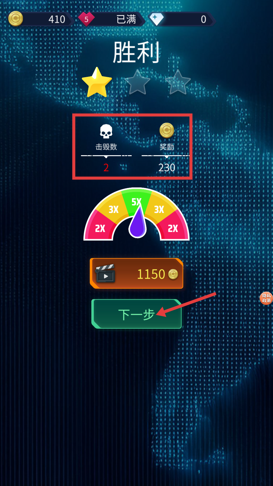 4、胜利后,获取【击毁数-2】与【奖励-230】金币,点击【下一步】,继续挑战后续关卡或领取额外奖励。