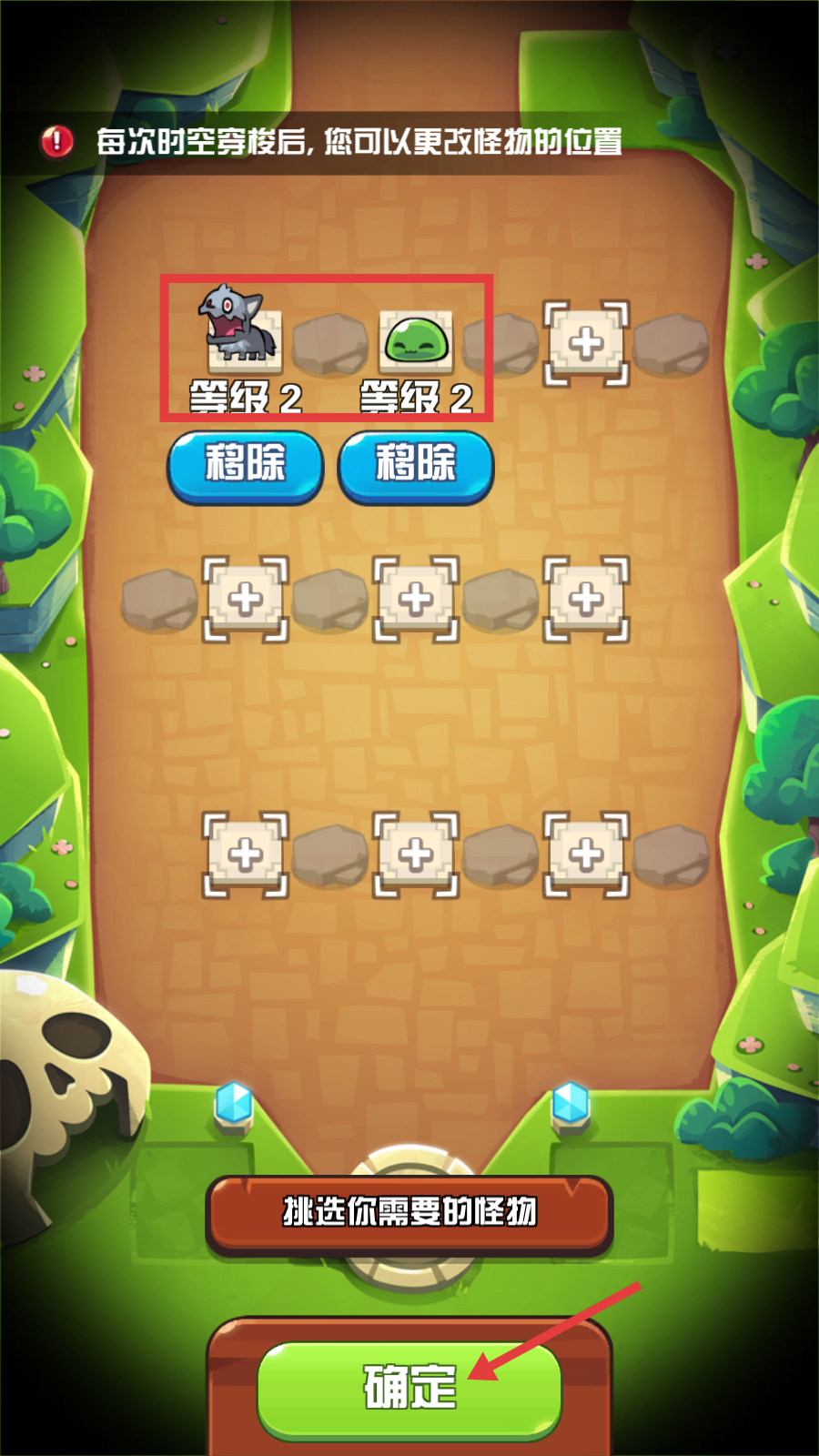 4、消耗金币升级【等级2-怪物】,提升其攻击力,助力后续关卡战斗,强化防御能力。