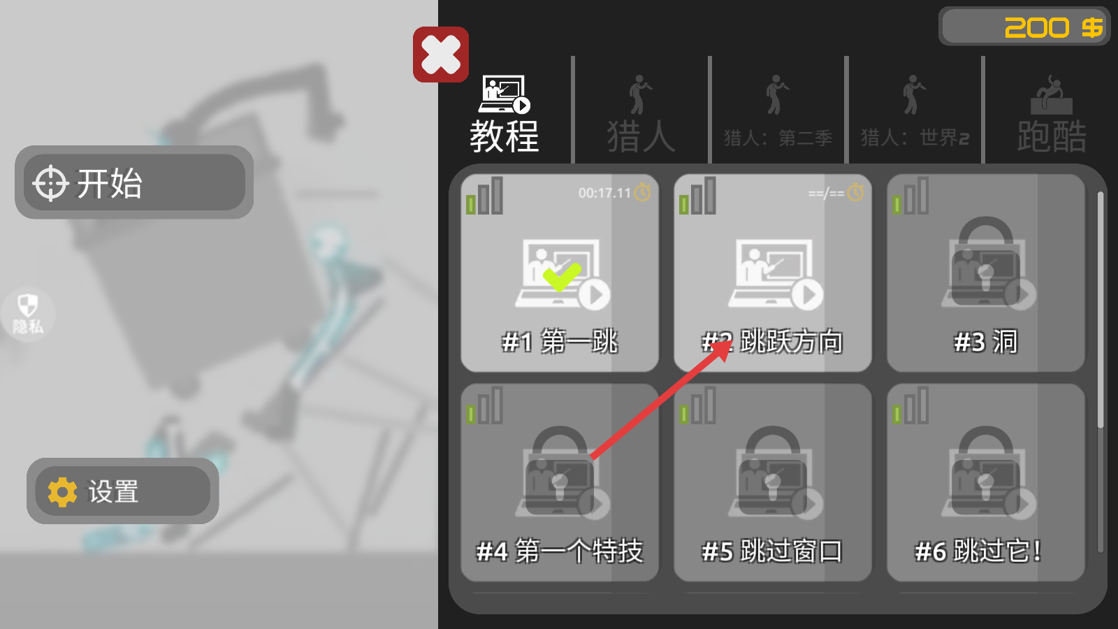 1、进入教程界面,选择【#2-跳跃方向】,开始学习跳跃方向的操作技巧,为后续关卡打好基础。