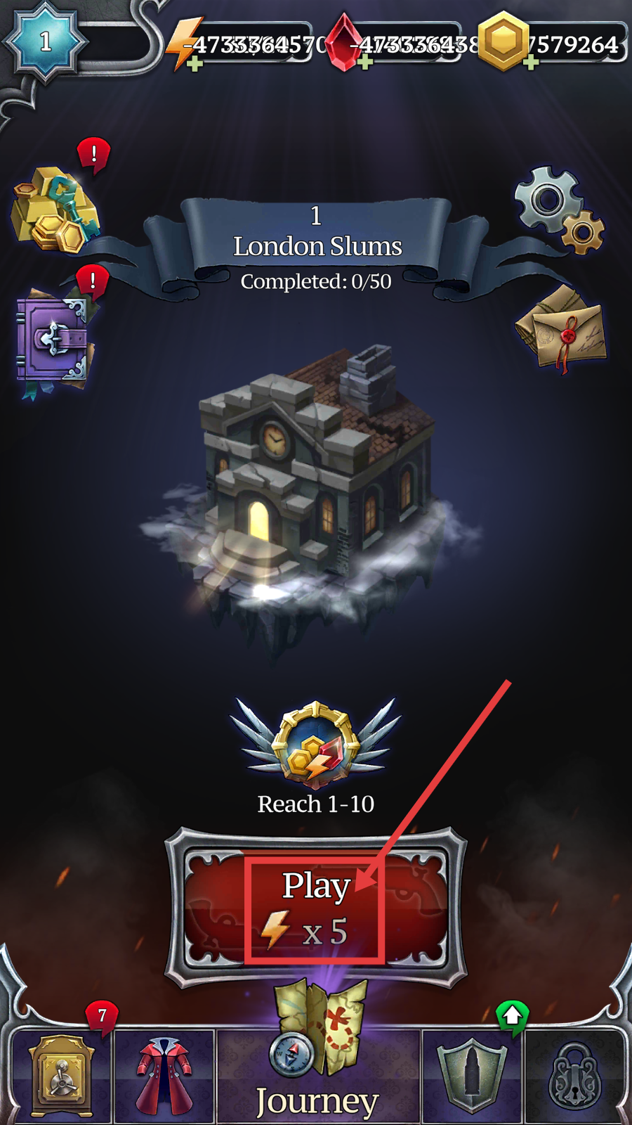 1、点击【Play-x5】按钮开始游戏,在【London-Slums】区域推进,目标完成50个任务,逐步解锁新内容。