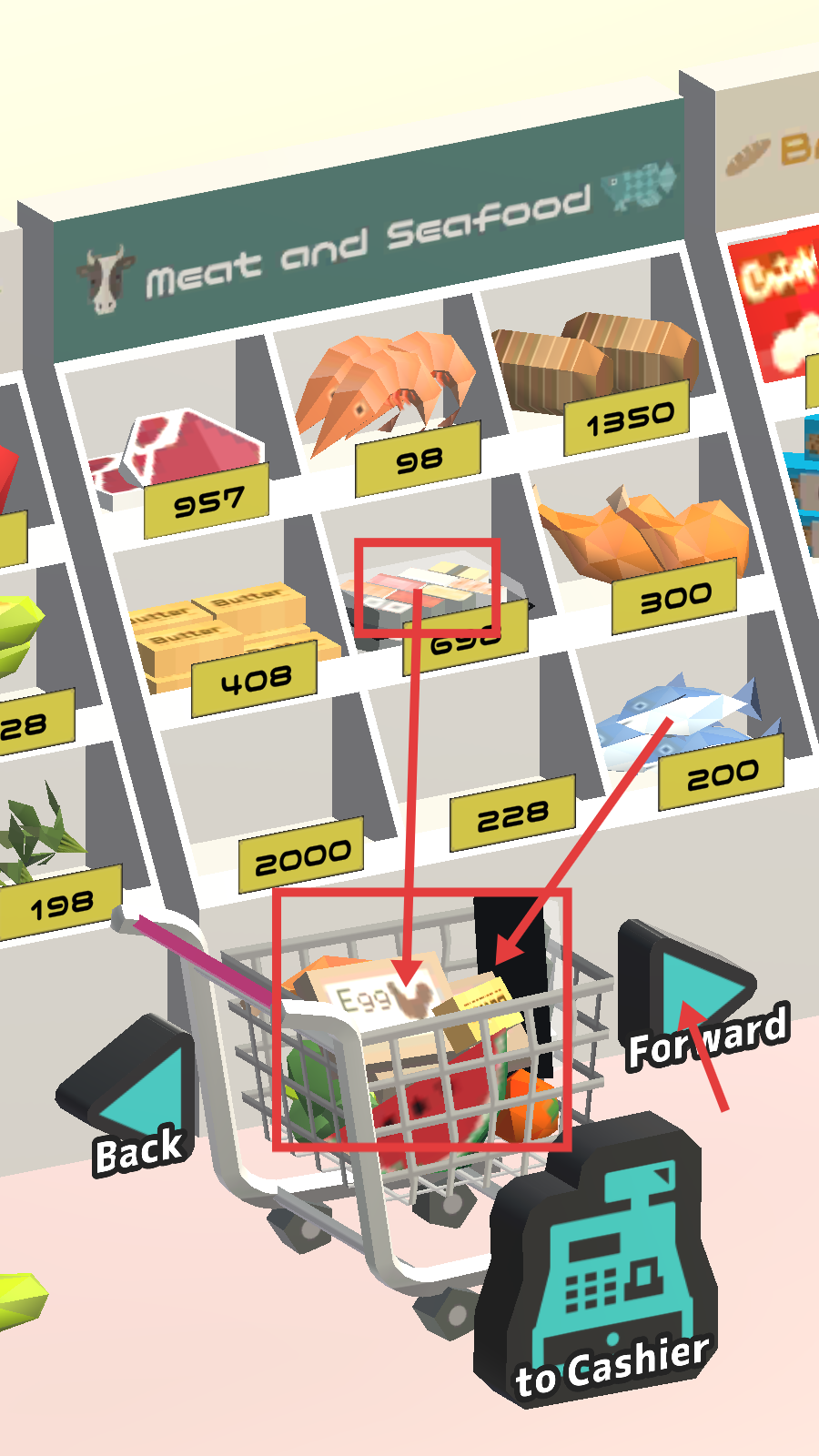2、在超市场景中,推购物车收集鸡蛋、西瓜等商品,通过【Forward】【Back】按钮移动,尽可能多装载商品。
