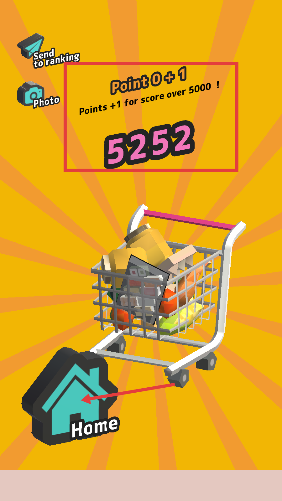4、结算后获得【5252】分数,满足5000分可加1点,点击【Home】按钮返回主界面,准备下一次购物挑战。